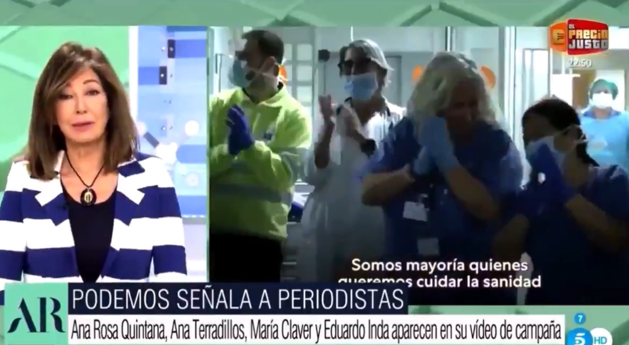 Ana Rosa Quintana ha aprovechado un espacio de 'El programa de Ana Rosa' para cargar contra Podemos, Pablo Iglesias y su nuevo nuevo vídeo electoral, en el que señala a la prensa. Concretamente, a cinco han sido los nombres que se han puesto sobre la mesa, de los cuales, tres son trabajadores del matinal de Telecinco, como ella misma ha señalado. En su discurso, la periodista asegura que se está haciendo una persecución a la prensa que no se veía desde el franquismo.