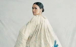 Pocos minutos antes de las doce de la noche, la presentadora se quitó la voluminosa una capa de tela de saco traída de Pakistán con un estampado realizado a mano por niños homenaje a la labor de Acnur, la agencia de la ONU encargado de proteger a los refugiados y desplazados, que dejó al descubierto su look de este año: un top en forma de paloma de la paz con una rama de olivo en su pico obra del escultor y pintor Jacinto de Manuel y una falda transparente de tul con una larga cola que dejaban ver su incipiente barriga de embarazada.