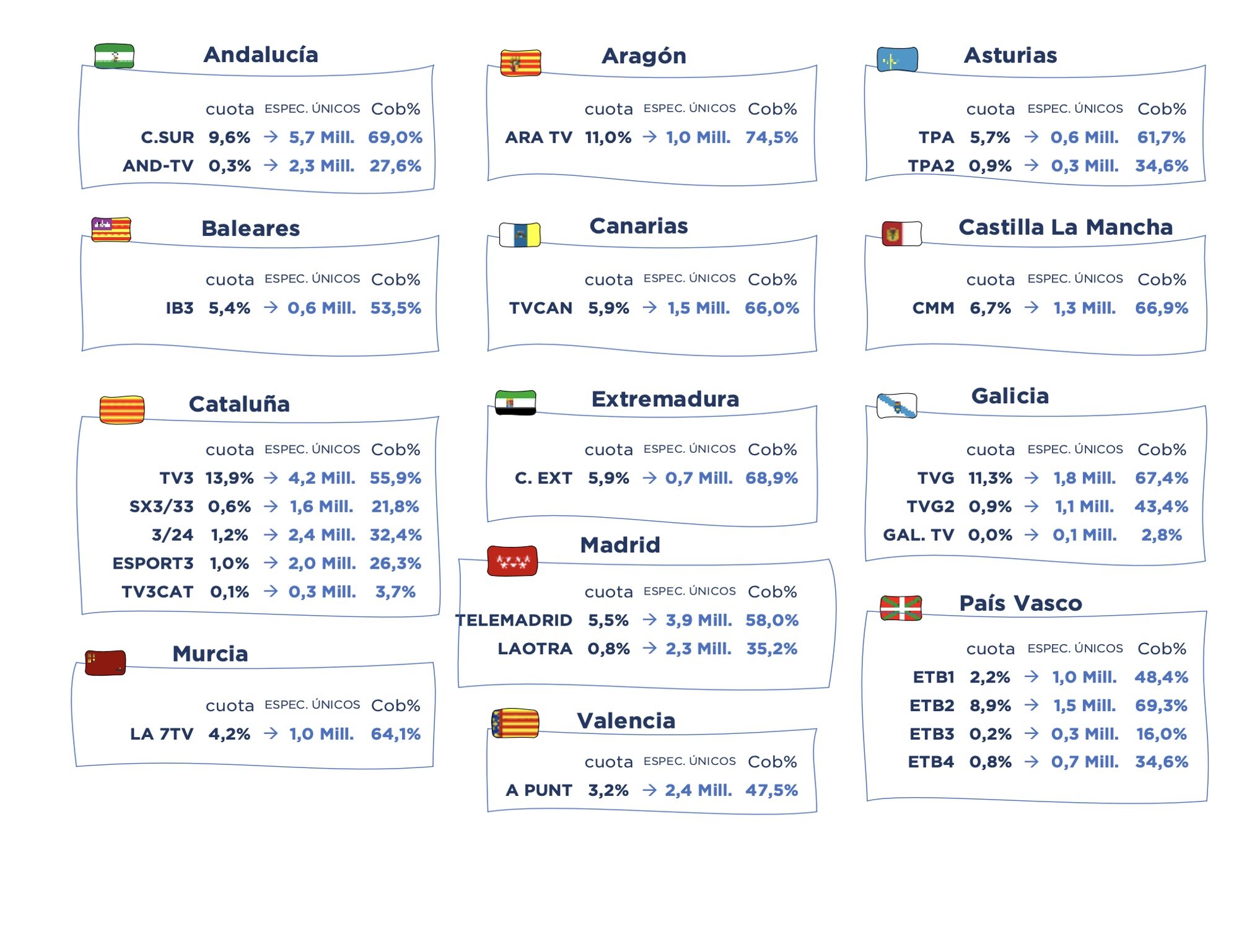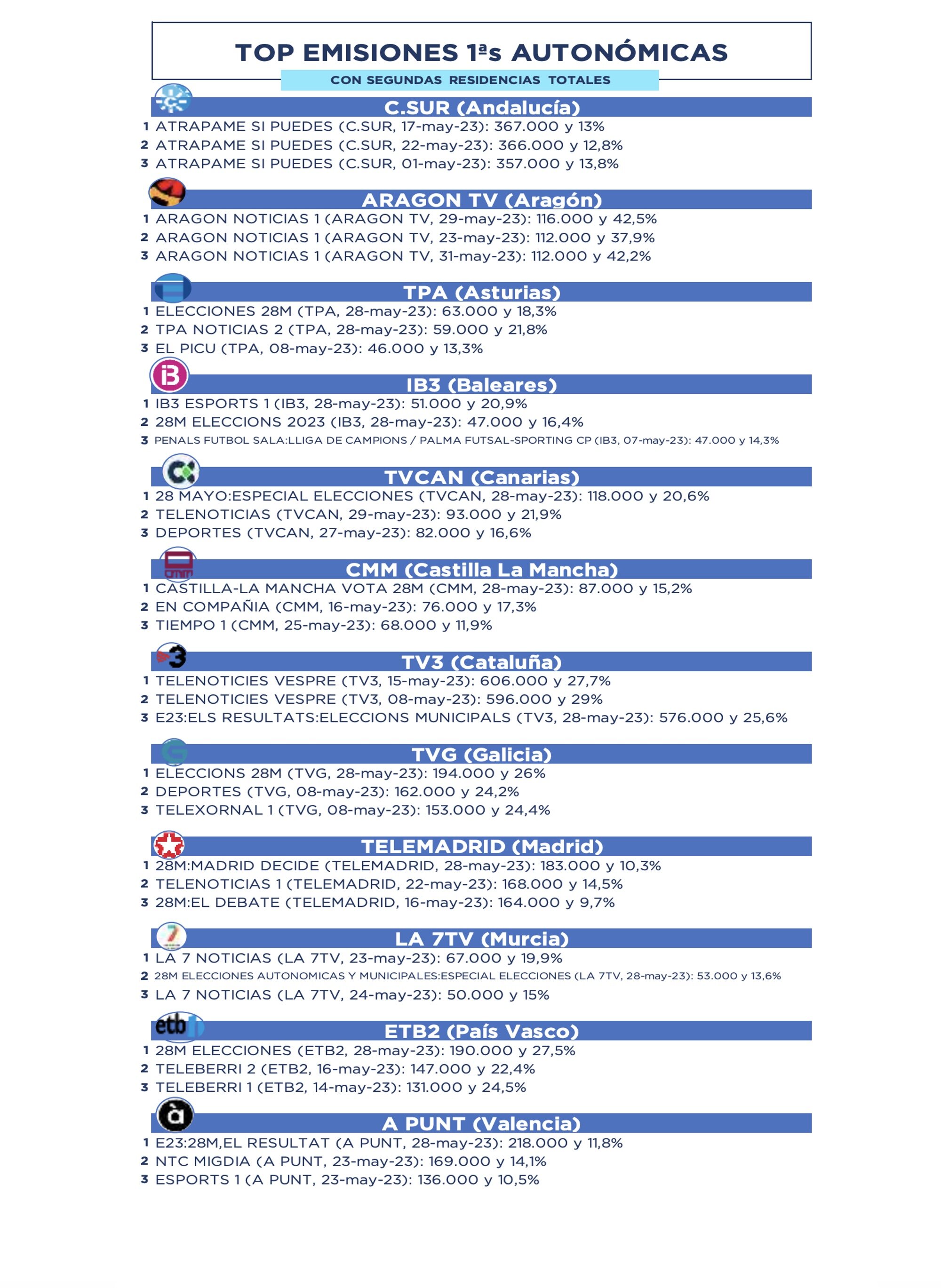 El conjunto de cadenas Autonómicas promedia el 8,7% de cuota de pantalla, su mejor mes de mayo de los últimos 10 años (2013). El número de espectadores únicos acumulados es de 29,5 millones, el 63,7 % de cobertura. La cadena autonómica con mayor cuota es TV3 (13,9%), TVG (11,3%), Aragón TV (11%), Canal Sur (9,6%), ETB2 (8,9%), CMM (6,7%), TVCANn (5,9%), Canal Extremadura (5,9%), TPA (5,7%) y Telemadrid (5,5%), entre las 10 primeras.