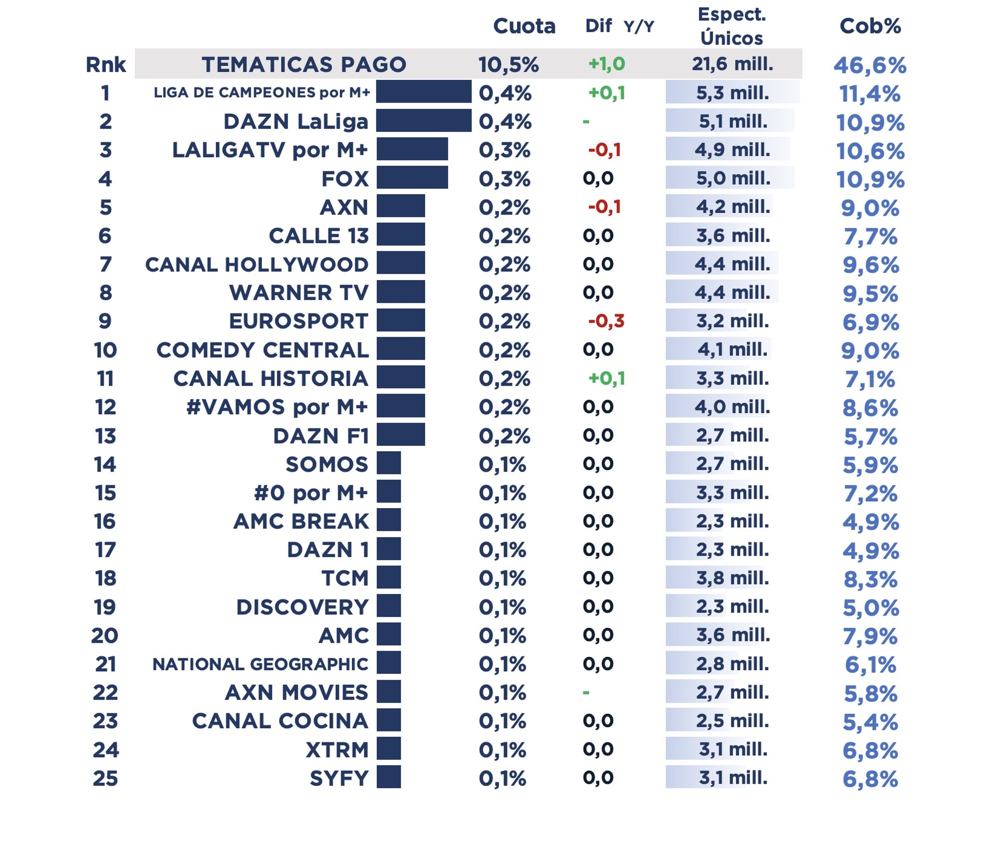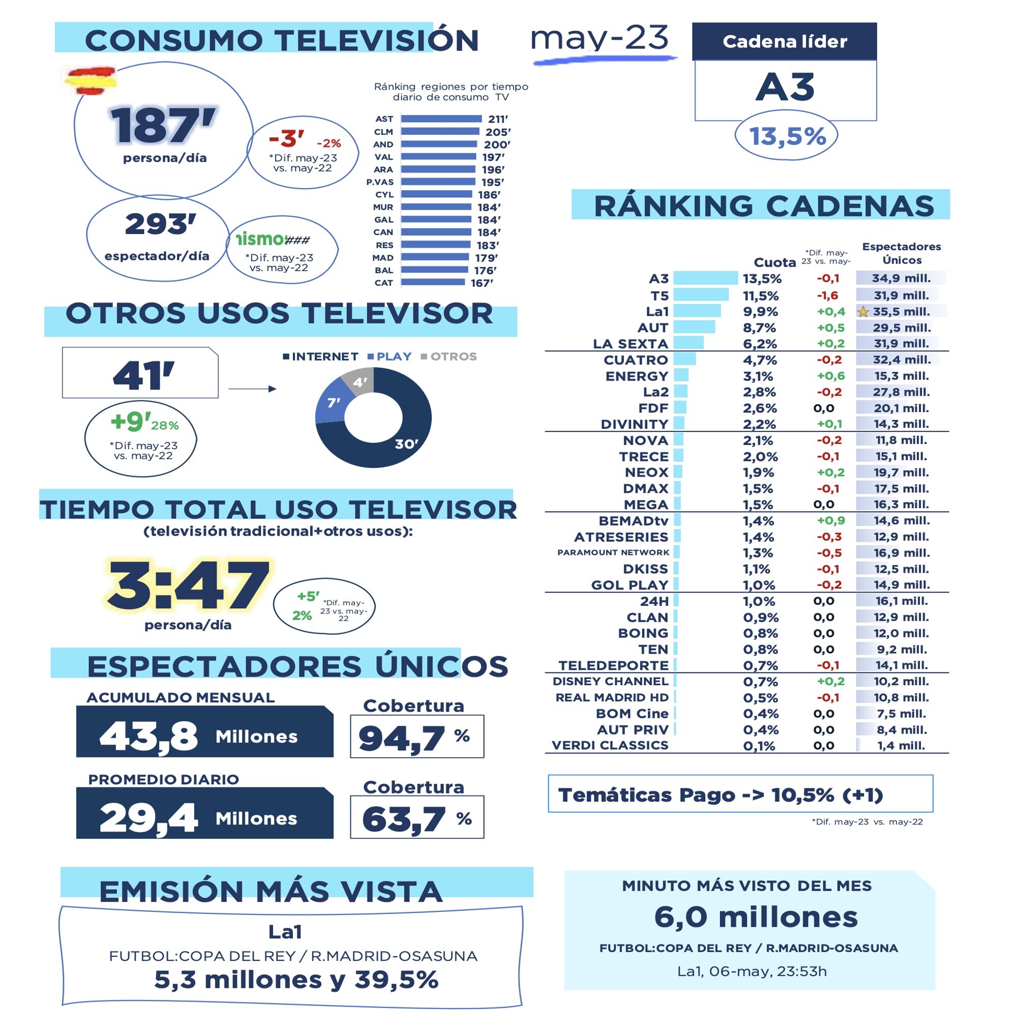 Las Temáticas de Pago (10,5%) logran el mejor mes de mayo de su historia. Los espectadores únicos ascienden a 21,6 millones, el 46,6% de cobertura poblacional. El ránking de cadenas de este grupo de 73 cadenas está conformado por Liga de Campeones por M+ (0,4%), Dazn LaLiga (0,4%), LaLiga por M+ (0,3%), Fox (0,3%), AXN (0,2%), Calle 13 (0,2%), Canal Hollywood (0,2%), Warner TV (0,2%), Eurosport (0,2%) y Comedy Central (0,2%).
