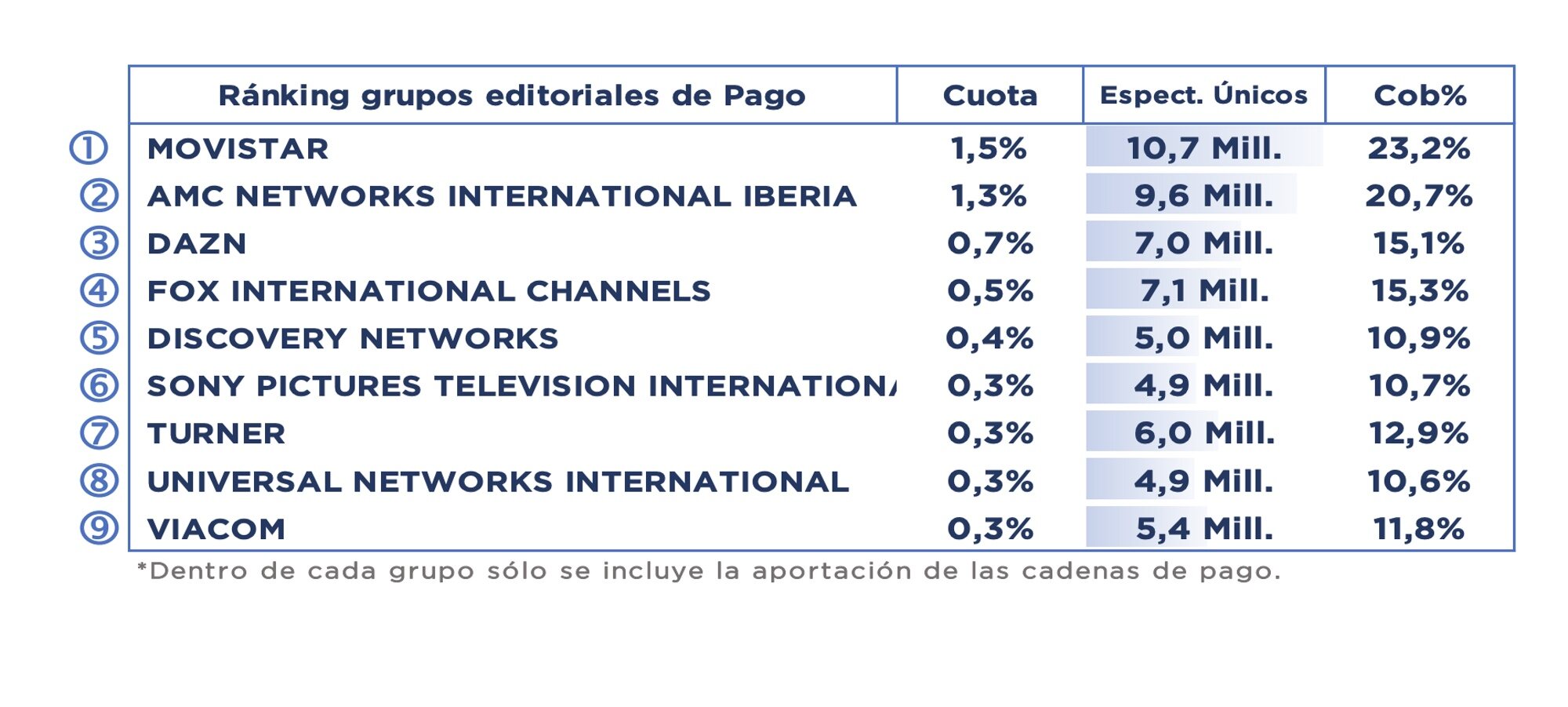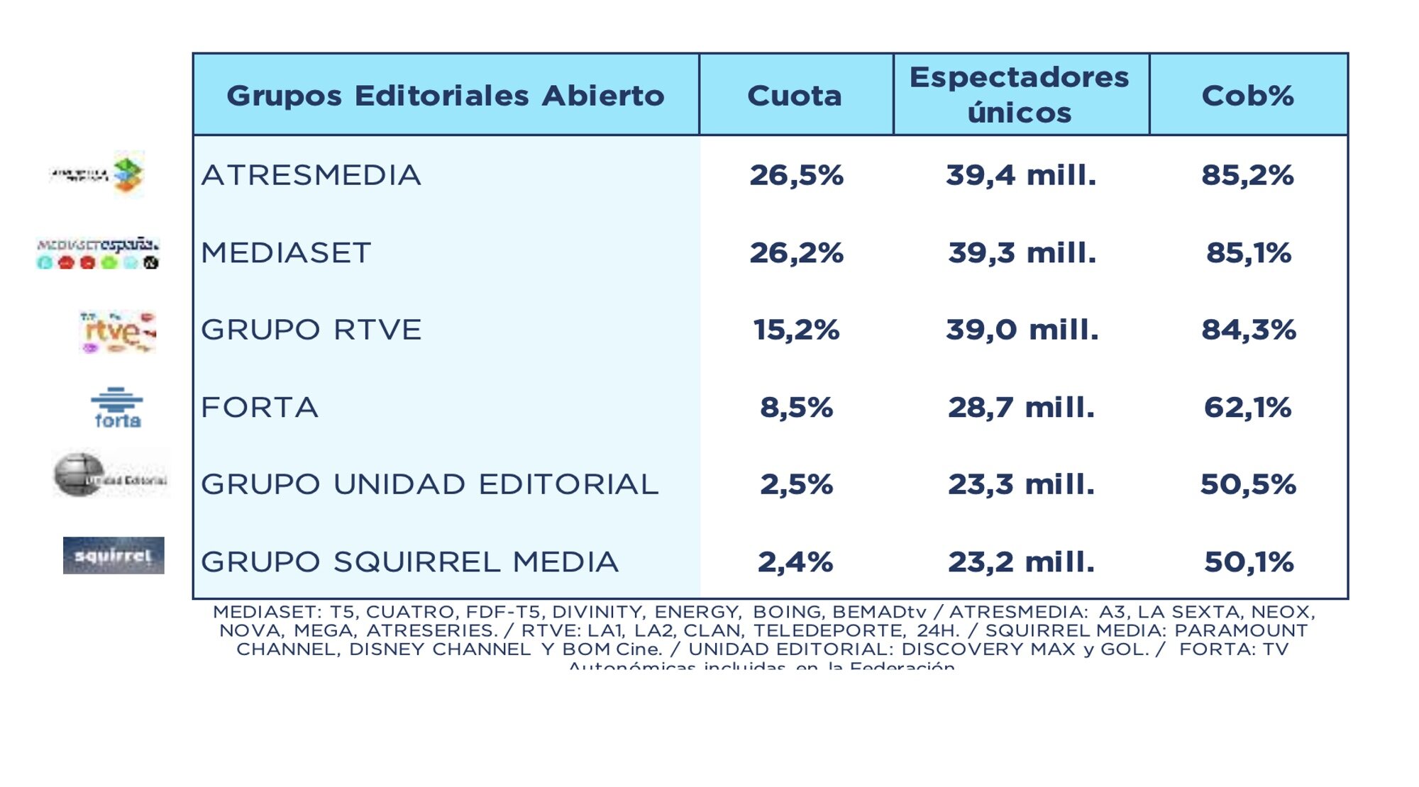 posición. Grupo RTVE (15,2%), que incluye cinco cadenas, ocupa la tercera posición. Les siguen Grupo Unidad Editorial (2,5%) con dos cadenas y Grupo Squirrel Media (2,4%) con tres cadenas