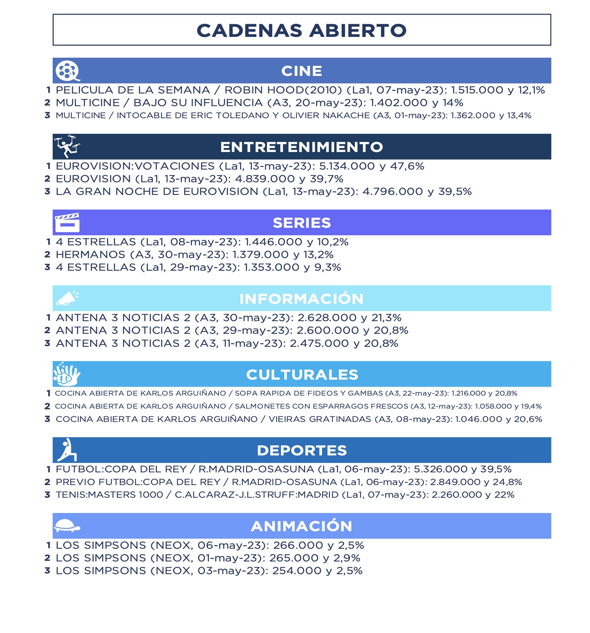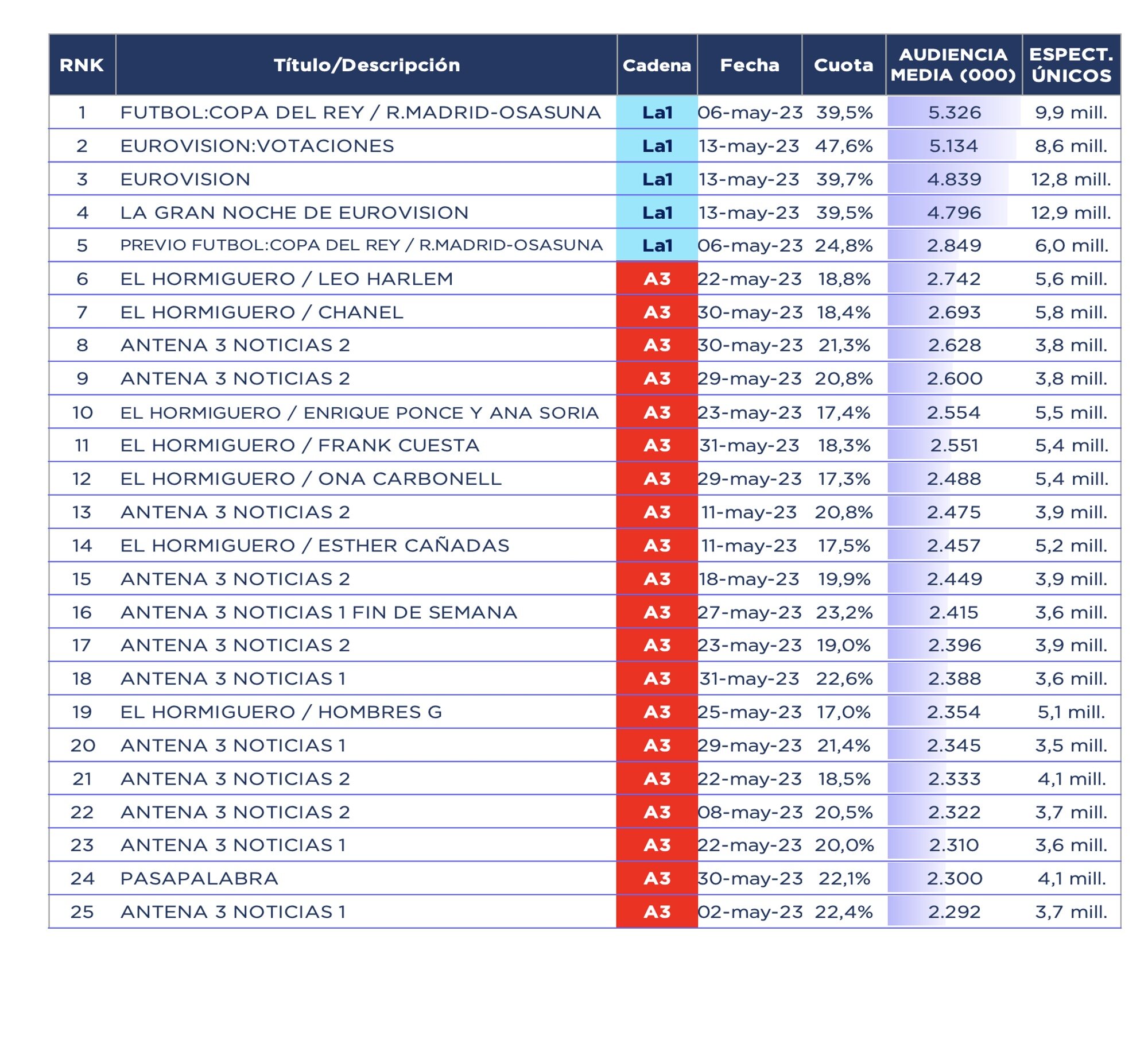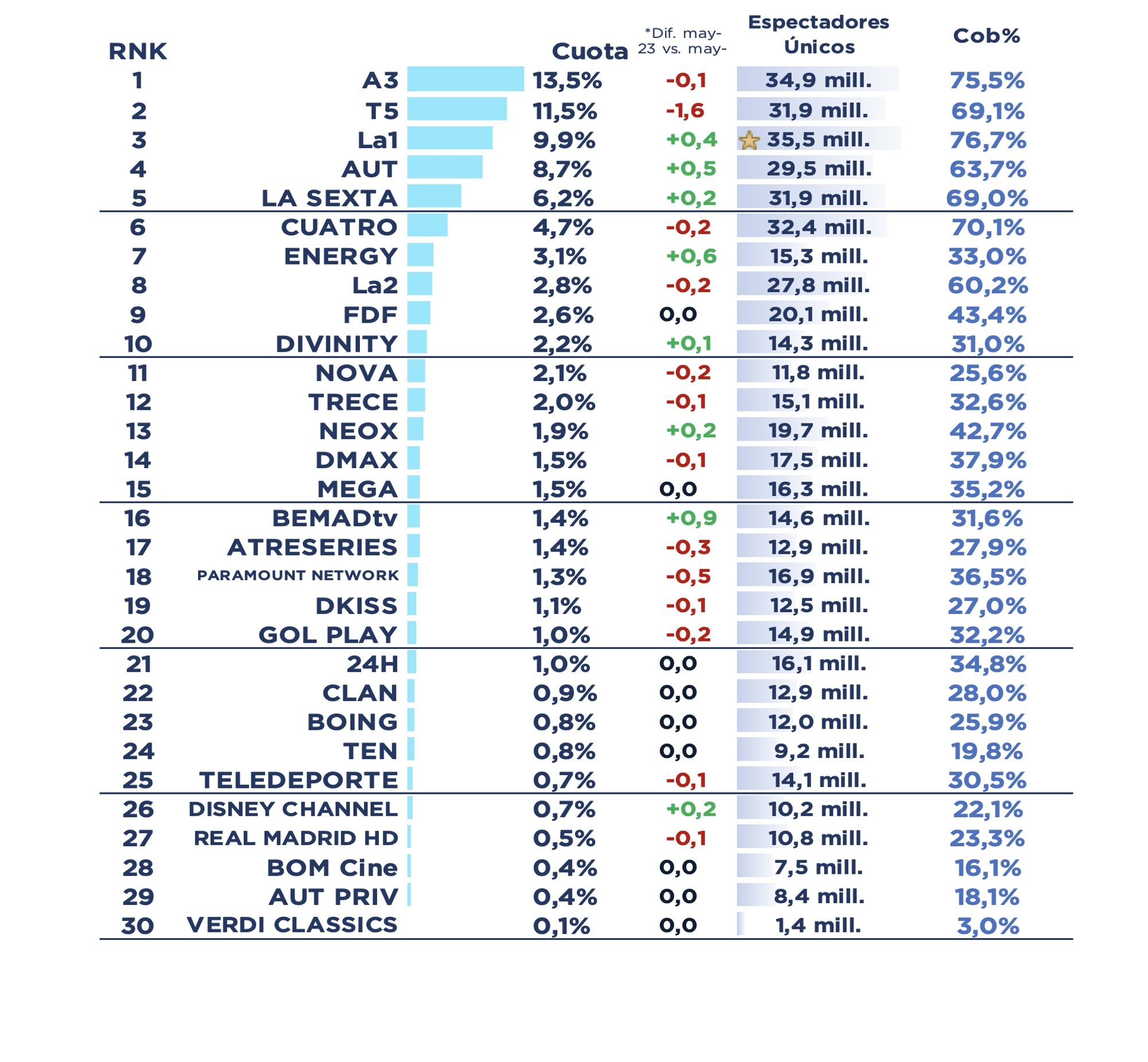 Antena 3 (13,5%) líder durante 19 meses consecutivos. Los espectadores únicos del total de las cadenas en abierto son 43,5 millones, el 94,7% de cobertura. Telecinco (11,5%) ocupa la segunda posición en el ránking de cadenas, con su mejor resultado de los últimos seis meses, pero con su peor mayo. En tercera posición se sitúa La 1 (9,9%), con su mejor mayo de los últimos cinco años.