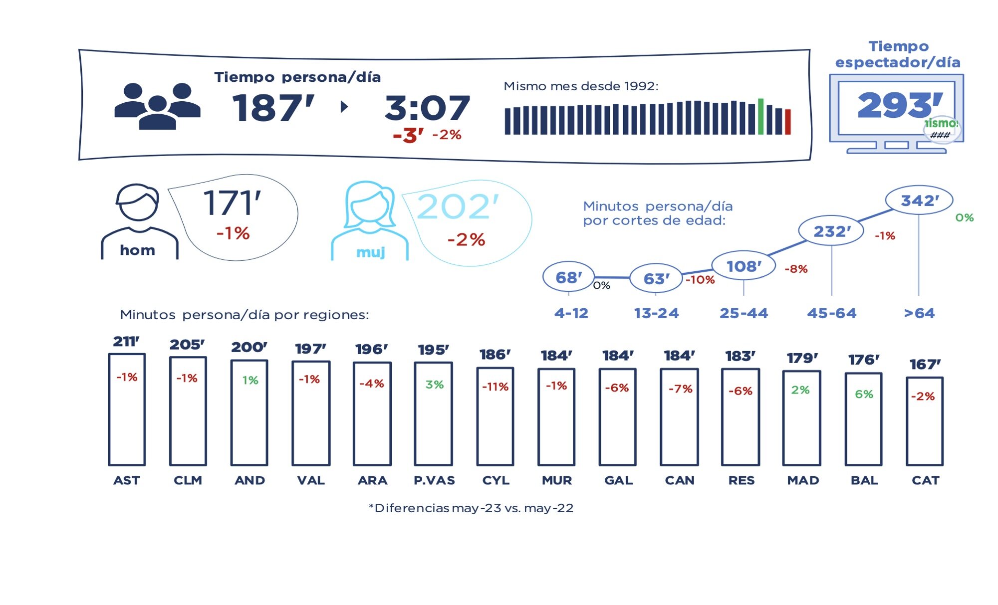 Los grupos sociodemográficos que más tiempo consumen televisión son las mujeres (202') y los mayores de 64 años (342') y, por regiones, Asturias (211'), Castilla La Mancha (205') y Andalucia (200'). Asimismo, el tiempo de consumo diario por espectador (sobre los que encienden/ven la televisión cada día) es de 293 minutos (mismos minutos que en mayo del año pasado).