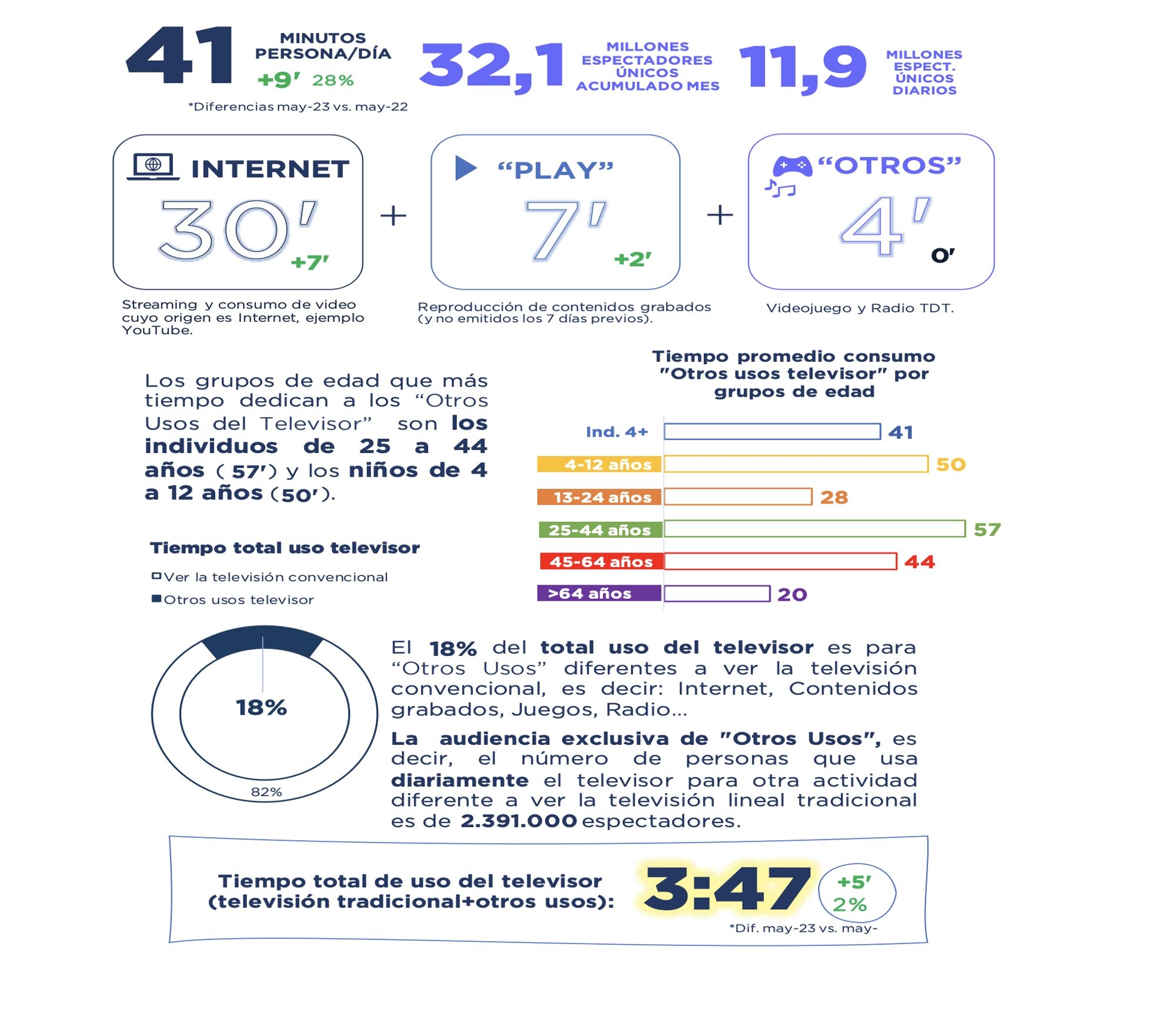 La audiencia exclusiva de "Otros Usos", es decir, el número de personas que usa diariamente el televisor para otra actividad diferente a ver la televisión lineal tradicional es de 2.391.000 espectadores. El tiempo total del uso del televisor (tradicional + otros usos) es de 3:47', lo que supone 5 minutos más que en mayo de 2022.