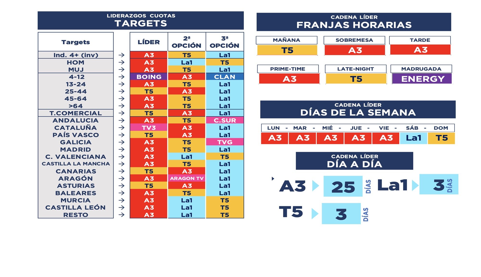 Por regiones Antena 3 es la cadena líder en Andalucía, Aragón, Baleares, C. Valenciana, Castilla La Mancha, Castilla León, Galicia, Madrid, Murcia. Por su parte, Telecinco lidera en País Vasco, Asturias y Canarias. La1 en Resto y TV3 es la cadena más vista en Cataluña. Por franjas horarias, Antena 3 lidera la sobremesa, la tarde, el prime time, mientras que Telecinco es la cadena más vista en la mañana y late night y Energy en la madrugada.