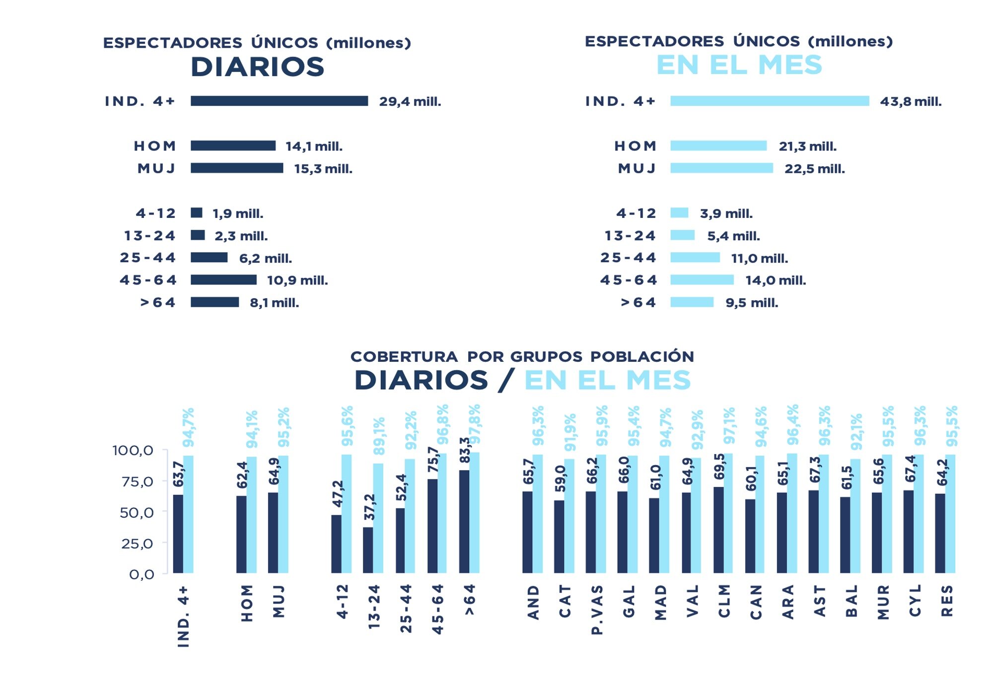 Antena 3 lidera en ambos sexos, en jóvenes de 13 a 24 años y en mayores de 45 años. Telecinco líder en los individuos de 25 a 44 años y en el target comercial. Boing líder en niños de 4 a 12 años.