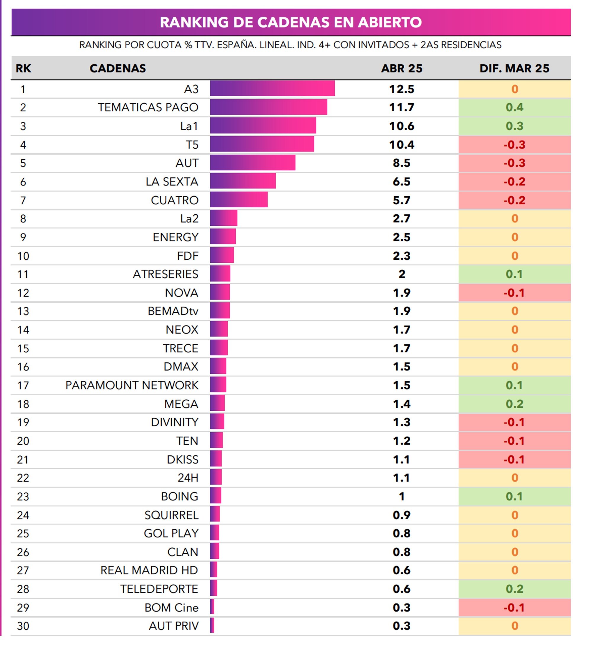 Antena 3 (12,5%) es la cadena más vista por noveno mes consecutivo, a 1,9 puntos de distancia de la segunda opción. La 1 (10,6%) crece tres décimas respecto a marzo y recupera la segunda posición, registrando su mejor dato mensual desde agosto y su mejor mes de abril desde 2014. Telecinco es la tercera cadena más vista del país y se mantiene por encima del doble dígito con un 10,4% de share. Energy (2,5%) vuelve a ser el canal temático TDT más visto, por tercer mes consecutivo, seguido de FDF (2,3%).