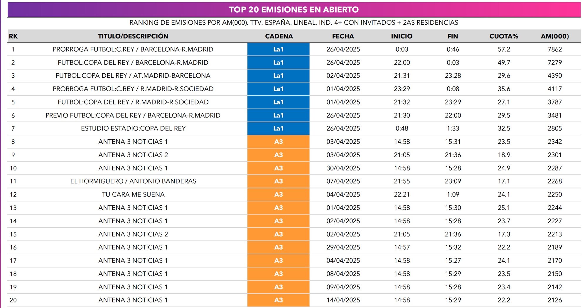 Si observamos el ranking de emisiones en abierto, la Copa del Rey, en La 1, domina las siete primeras, con la prórroga de la final como lo más visto con un 57,2% y 7.862.000 espectadores. El restante de emisiones pertenecen a Antena 3, con los informativos ocupando todos los huecos a excepción de la visita de Antonio Banderas a 'El hormiguero' y la gala de estreno de 'Tu cara me suena'.