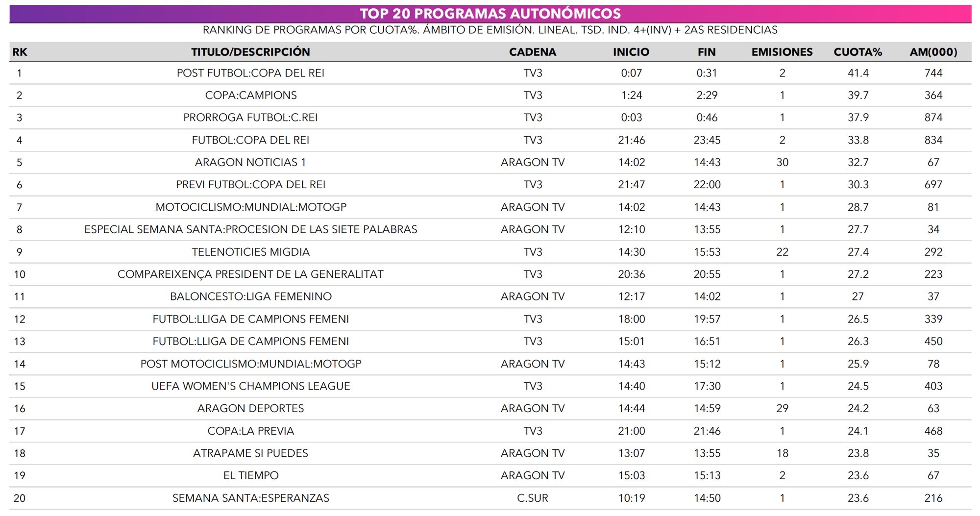 TV3 es la cadena autonómica líder en abril con un 14,5% de share. Repite como la cadena más vista en Cataluña, y la cadena de FORTA con mejor resultado del mes. Aragón TV (12,1%) crece cuatro décimas y se mantiene como la segunda cadena más seguida de FORTA en el mes de abril. Canal Sur (9,3%) cierra el top 3, mejorando en 1,2 puntos el dato de abril del año pasado. La7 TV (4%) consolida su crecimiento en Murcia y firma su mejor dato mensual desde febrero de 2024. ETB1 crece dos décimas respecto al mes de marzo y firma un 2% de share.