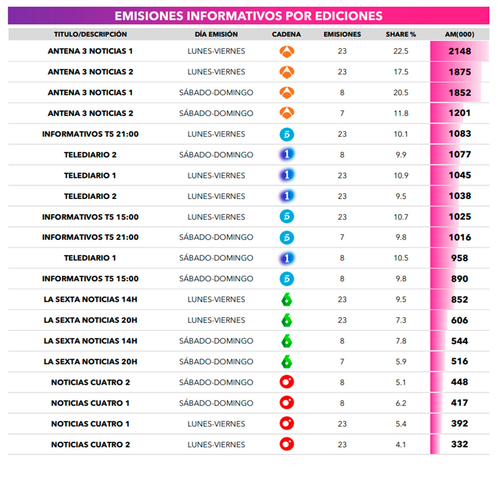 'Telediario' promedia un 10,1%, cediendo -0,2 puntos, con 1.033.000 espectadores, mientras que 'Informativos Telecinco' registra un 10,3%, bajando -0,5 puntos en un mes, y cosechando 1.026.000 espectadores de media en mayo. laSexta se mantiene en cuarta posición con un 7,9% y 657.000 espectadores de media con sus 61 emisiones, dejándose -0,1 puntos respecto al mes de abril. Cuatro marca un 4,9% con 383.000 espectadores en mayo, mejorando levemente +0,1 puntos en un mes.