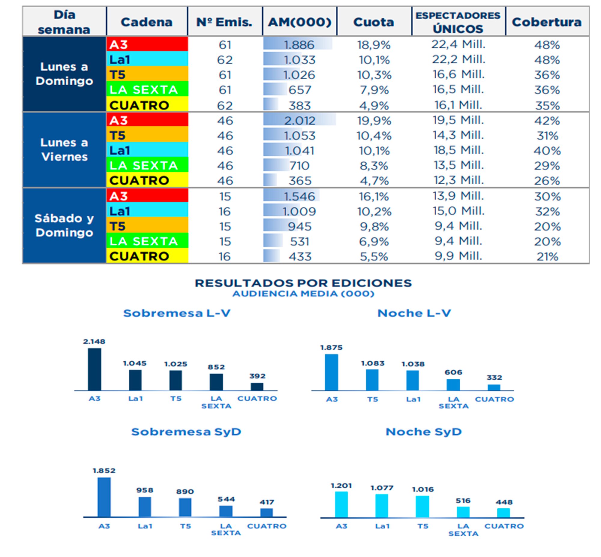 A la hora de fijarnos en los datos de la sobremesa de lunes a viernes, vemos de forma más clara el sorpasso de La 1 a Telecinco, donde la pública promedia 1.045.000 espectadores y Telecinco 1.025.000. En la noche de lunes a viernes, Telecinco recupera la segunda posición con un promedio de 1.083.000 espectadores, alejándose de La 1 que registra 1.038.000 espectadores.