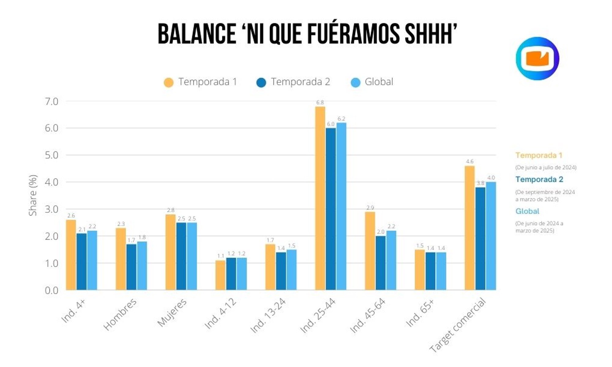 En la segunda temporada de 'Ni que fuéramos Shhh', que arrancó en septiembre de 2024 y terminó el 27 de marzo de 2025, el programa ha cedido en share al 2,1% con 175.000 espectadores, bajando -0,5 puntos con respecto a su primera temporada. El formato vuelve a imponerse en mujeres (2,5%) frente a hombres (1,7%) y el 6,8% de la primera temporada del rango de edad de 25 a 44 años pasa a ser un 6% en la segunda. El target comercial también baja al 3,8% en su temporada 2.