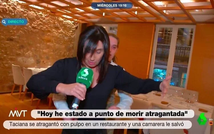 "Estábamos grabando un reportaje mi compañera Marina y yo, y después de grabar todo, el jefe nos invitó a una tapa de pulpo", comenzaba narrando la reportera, seguido del grave suceso: "La metí en la boca, no debí masticarlo tanto como debía y me atraganté, se me quedó aquí", decía señalándose el cuello. No podía respirar, su compañera le daba golpes pero no le hacía nada, intentaba beber pero no podía...