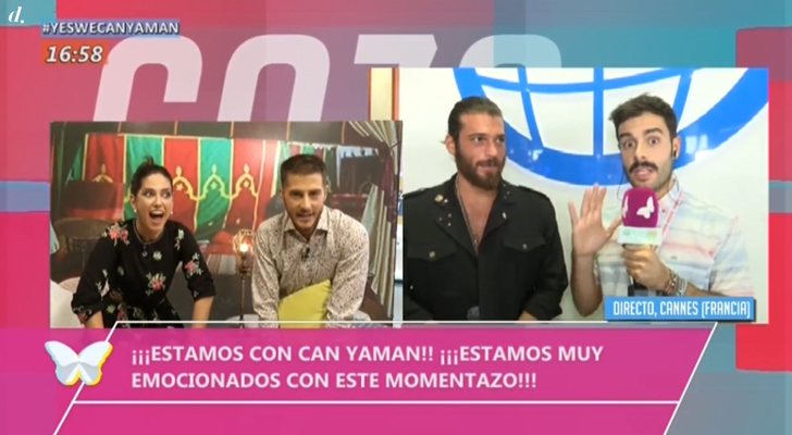 La tarde del miércoles 16 de octubre, 'Cazamariposas' tuvo ocasión de charlar con un invitado muy especial que revolucionó tanto a Nuria Marín y Nando Escribano: el actor turco Can Yaman, conocido en España por sus papeles protagonistas en telenovelas como 'Erkenci Kus: Pájaro soñador' y 'Dolunay'. Para ello, el programa envió a Germán González, uno de sus reporteros, a Cannes, donde se encontraba el intérprete, quien protagonizó una conexión en directo con unos entusiasmados presentadores.
