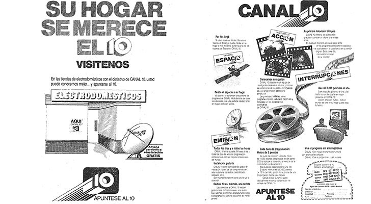 La emisión de Canal 10 duró exactamente 7 meses y 7 días y se produjo a través del satélite IntelSat 5, que formaba parte del proyecto de una red de satélites para la retransmisión internacional. No hacía falta mucho para sintonizarlo: solo un receptor de señal analógica por satélite y una parabólica. En el imaginario colectivo solo quedan como pioneras Telecinco y Antena 3, que comenzaron a emitir tras la aprobación de la Ley de Televisión Privada de 1988, pero Canal 10 ya lo hacía antes. Quizá este desconocimiento se deba a que la cadena privada solo operaba en grandes ciudades como Madrid, Bilbao o Valencia, aunque se anunció en la televisión pública y en grandes periódicos bajo el lema "¡Apúntese al 10!".