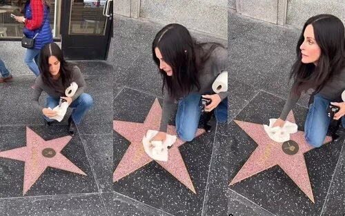 Cientos de ciudadanos y turistas pasan por Hollywood Boulevard a diario, por lo que en el clip que han mostrado en las redes sociales se ve a gente pisando la estrella de Cox. No se aguanta y sale con papel higiénico y productos de limpieza para dejarla como los chorros del oro, mientras pide a los viandantes que también podrían rodearlo en lugar de pisarlo. Tampoco se ha olvidado de sus amigas, pues acto seguido ha limpiado también las de Laura Dern, Jennifer Aniston y Reese Witherspoon.