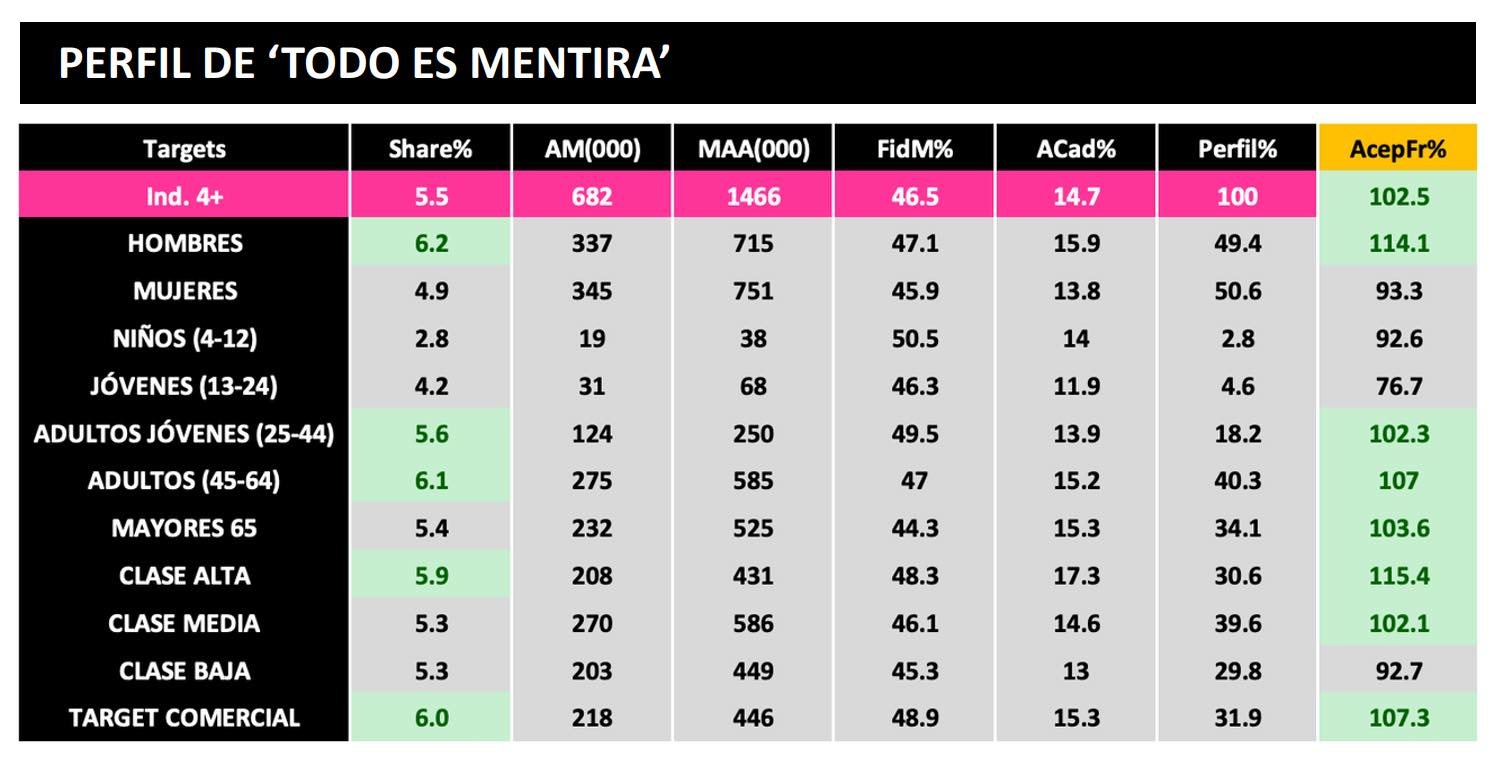En cuanto al tipo de espectador que tiene cada espacio, con datos analizados del 1 de mayo al 11 de agosto de 2020 podemos ver cómo 'Todo es mentira' funciona mejor entre los hombres (6,2%) que las mujeres (4,9%) y su público predilecto es el de adultos jóvenes de 25 a 44 años (5,6%) y adultos de 45 a 64 años (6,1%), targets en los que logra sus mejores cuotas. Además, gusta más entre los espectadores de clase alta (5,9%), frente al 5,3% de los de clase media y baja. Cabe destacar que el espacio mejora en un +2.5% la media del canal y sobresale en cuanto a target comercial se refiere (6%).