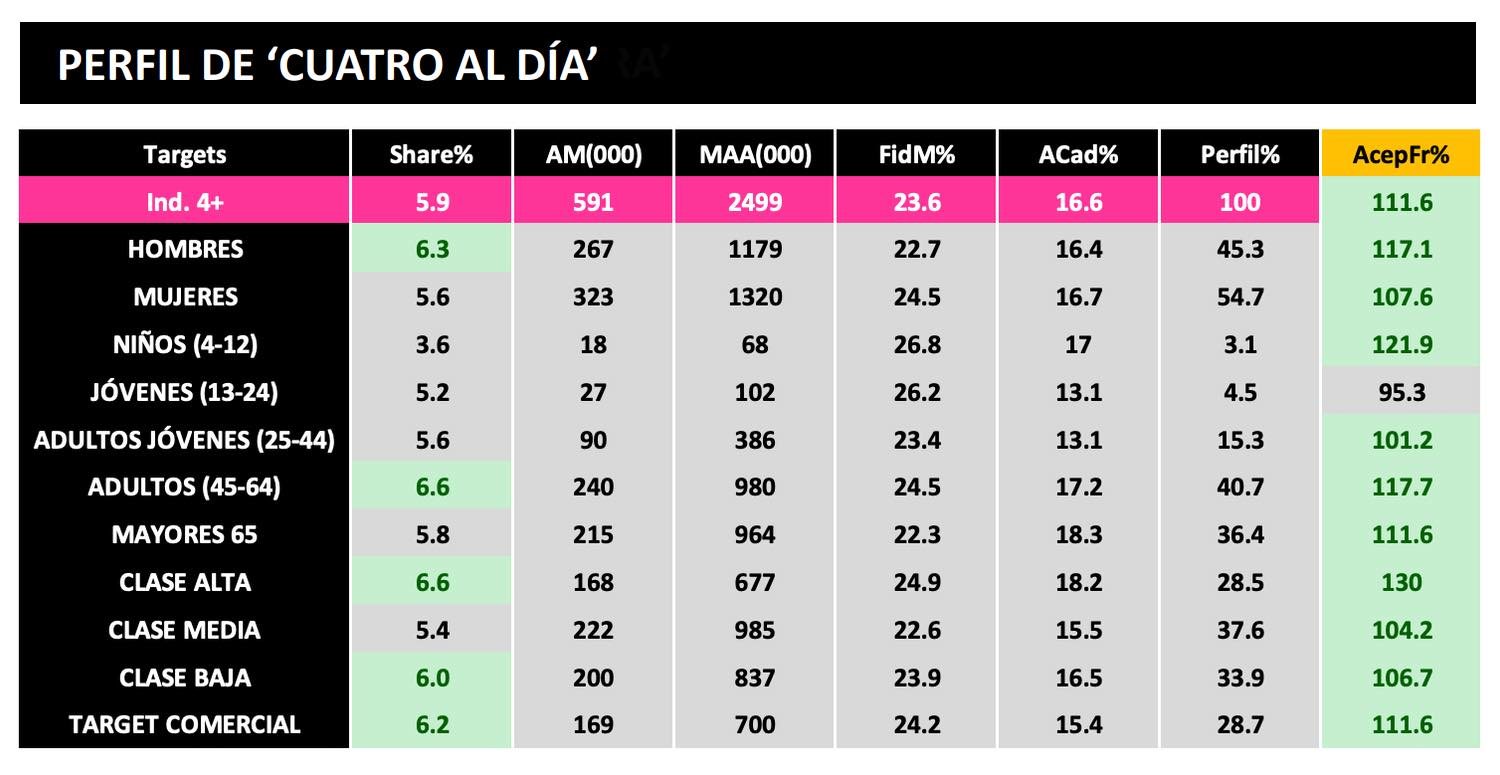 'Cuatro al día' también funciona mejor entre hombres (6,3%) que mujeres (5,6%) y destaca entre los espectadores de 45 a 64 años (6,6%). Después, su audiencia más fiel la encontramos en los mayores de 65 años (5,8%) y adultos jóvenes de 25 a 44 años (5,6%). El magacín informativo funciona mucho mejor en el público de clase alta (6,6%) y baja (6%) y mantiene un 5,9% de share desde mayo, con plusvalías del +11,6% respecto a la media del canal. Mejora este dato en cuanto a perfil comercial se refiere, ya que su TC en este periodo de análisis es del 6,2% de cuota media, mejorando también en un +11,6 el TC medio del canal.
