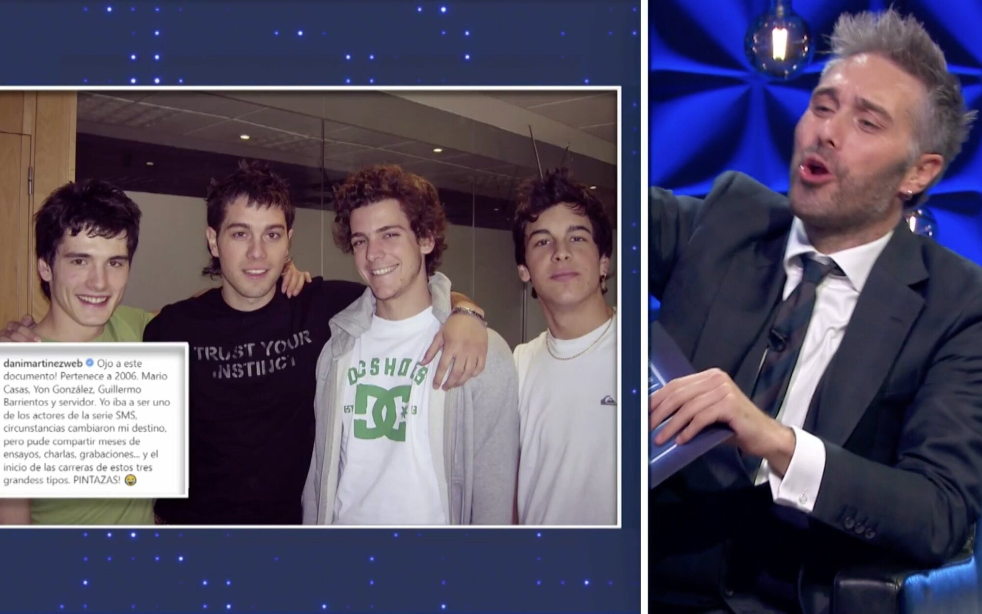 Como muchas otras series de adolescentes, 'SMS' sirvió de gran cantera para casi todo su reparto. Un ejemplo de ello es Amaia Salamanca, quien acudió a 'Martínez y hermanos' y recordó lo que ocurrió en los primeros días de grabaciones que compartió junto al presentador del programa. Además, Amaia aprovechó su visita al formato de Movistar+ para mostrar una foto en la que aparecía Dani Martínez, junto a Yon González, Guillermo Barrientos y Mario Casas hace más de 15 años.