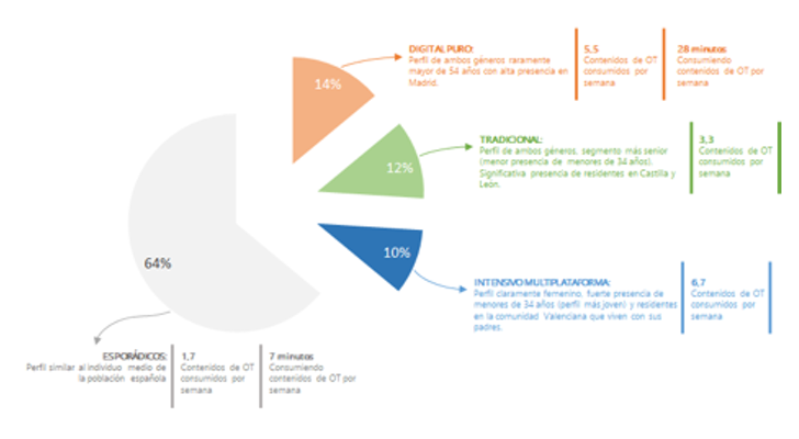 El estudio determina que hay cuatro tipos de perfiles de espectadores diferenciados. Por un lado, el "Digital Puro", un perfil de joven que no consume contenido en televisión, que invierte 28 minutos en el consumo semanal de 'OT' y ve una media de 5,5 contenidos. Por otro lado está el espectador "Tradicional", que tiene un perfil más senior, que ve contenido digital si no se ha perdido la gala (una media de 3,3 contenidos que equivalen a 1h10 de consumo). El tercer perfil que se desprende del estudio es el "Intensivo multiplataforma", mucho más femenino y joven, que consume 3 horas semanales (6,7 contenidos) y que sigue el programa en todas sus ventanas de visualización de manera puntual e intensiva. Finalmente, y también evidentes el último perfil: el "Esporádico". Es similar a la población española que ve algún contenido relacionado con el programa, en este caso 1'7 contenidos de media y 7 minutos de consumo.