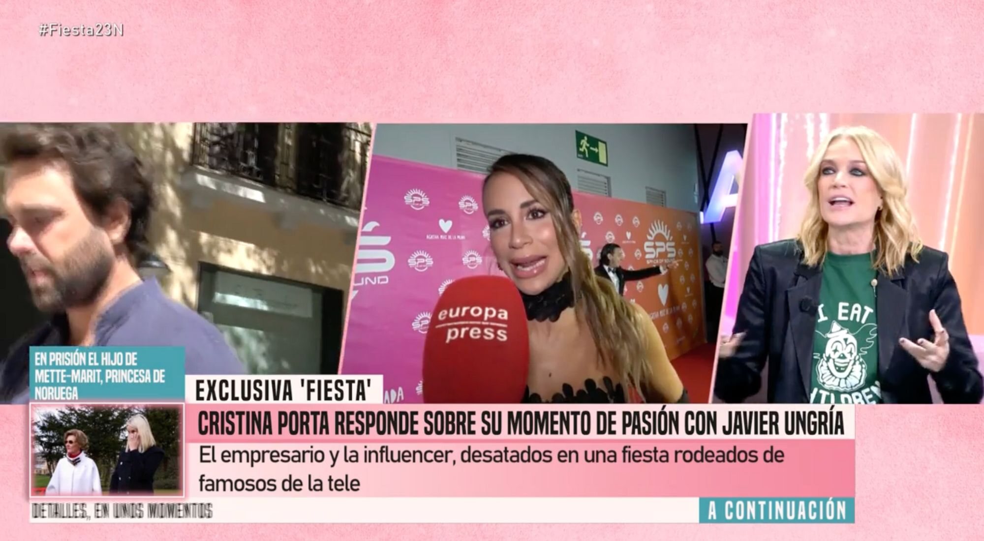"¿No hubo beso? Pues vaya mierda de...", estallaba decepcionada la presentadora desatando las risas de sus compañeros. "Es verdad que estuvieron bailando, hay una química estupenda, son dos guapos guapísimos, están solteros y estuvieron mucho tiempo charlando muy cerca", aportaba Almudena del Pozo la visión de Porta. "Sí es verdad que se gustan un poco, pero he hablado con Cristina y me dijo que no hubo beso", confirmó la colaboradora la falsedad de la exclusiva.