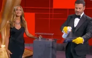Jennifer Aniston se presenciaba sobre el escenario para entregar el primer premio de la noche, el de Mejor actriz de comedia que iba a parar a Catherine O'Hara por 'Schitt's Creek'. Pero antes de conocer el nombre que guardaba el sobre, Kimmel quiso ser precavido y eliminar todos los virus y bacterias que pudiera tener, para que así ninguno de los dos corriera el riesgo de infectarse.