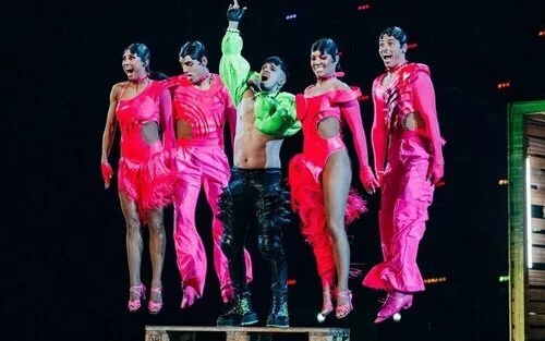 El penúltimo país en pisar el escenario de Liverpool en el segundo día de ensayos fue Bélgica. Gustaph, vestido también de color rosa y blanco, está acompañado de tres coristas y una bailarina. En cuanto a props, el belga trae una escaleras enormes y los visuales muestran movimientos de vogue y la letra de la canción.
