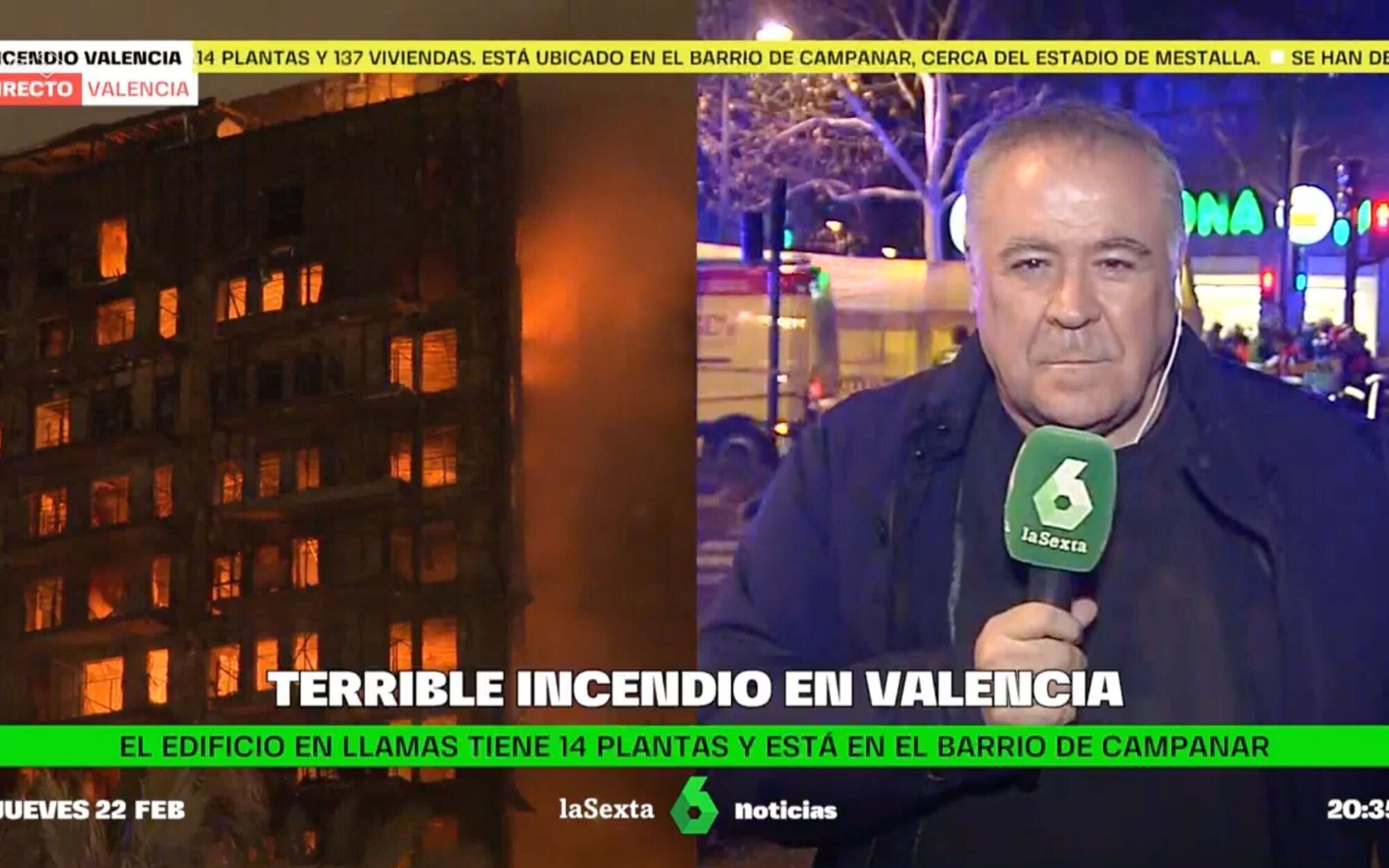 Durante la tarde del jueves 22 de de febrero comenzó un grave incendio que arrasó un edificio de 14 plantas en el barrio de Campanar, en Valencia, y que ha causado la muerte de cuatro personas y la desaparición de 19. Desde el primer momento, las cadenas de televisión en España se han hecho eco de la noticia y han decidido cubrir minuto a minuto el avance de las llamas, cambiando incluso algunas de ellas su programación. En el caso de laSexta, Antonio García Ferreras ha viajado a Valencia para informar a pie de calle de la situación.