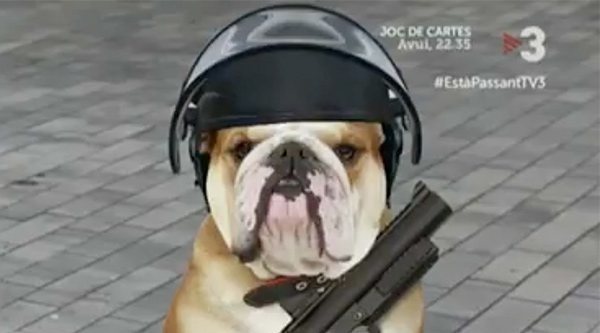 Magí Modgi, colaborador de 'Està passant!', fue el que comentó una de estas imágenes de un bulldog inglés con una gorra de policía: "Estos días, si nos encontramos con algún perro como el de la foto, tenemos que ir con mucho cuidado porque son muy agresivos, hasta diría que rabiosos". El presentador, Toni Soler, pidió calma y, tanto él como el colaborador, matizaron que se referían a los perros.