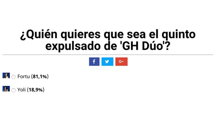 De esta manera, la aventura en pareja para ellos ha terminado. Y es que el dúo formado por Fortu y Yoli va a separarse definitivamente el 14 de febrero, ya que uno de los dos concursantes va a ser el expulsado. Y los usuarios de FormulaTV lo tienen más que claro. Con un 81,1% de los votos, estos quieren que sea el cantante quien abandone la casa de Guadalix, mientras que tan solo un 18,9% quieren que sea Yoli quien sea la que pise el plató del programa la noche del jueves.