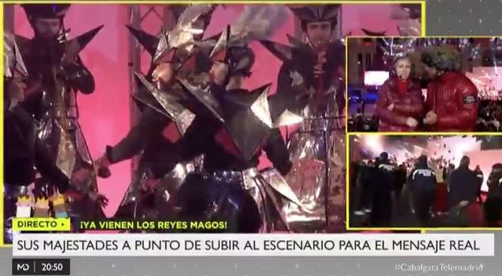 Pineda y Galván se encontraban este lunes 5 de enero liderando un programa especial con el que 'Madrid directo' estaba cubriendo la gran Cabalgata de Reyes que recorrió el centro de Madrid, desde la Castellana hasta Cibeles. Con la ayuda de su amplio equipo de reporteros, contaron minuto a minuto lo que estaba sucediendo y fue precisamente al final de la retransmisión cuando nombraron a su compañera de Campanadas. Cuando los tres Reyes Magos estaban a punto de llegar a la puerta del Ayuntamiento de Madrid vimos un espectáculo protagonizado por un conjunto de figurantes que se encontraban disfrazados con unos trajes que simulaban metal; un material que recordaba sin duda al atuendo de Pedroche el 31 de diciembre de 2019.