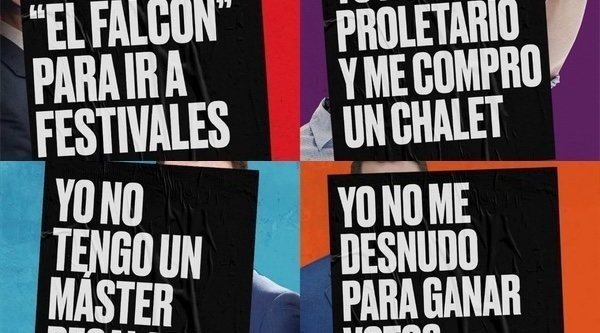 Las referencias a los partidos políticos son más que evidentes y más si van acompañadas del color del fondo. "Yo no cojo 'El falcon' para ir a festivales", con el fondo rojo; "Yo no voy de proletario y me compro un chalet"; con el fondo morado; "Yo no tengo un máster regalado", con el fondo azul; y "Yo no me desnudo para ganar votos", con el fondo naranja. Por si cabe alguna duda, hacen alusión al PSOE, Podemos, PP y Ciudadanos, respectivamente.