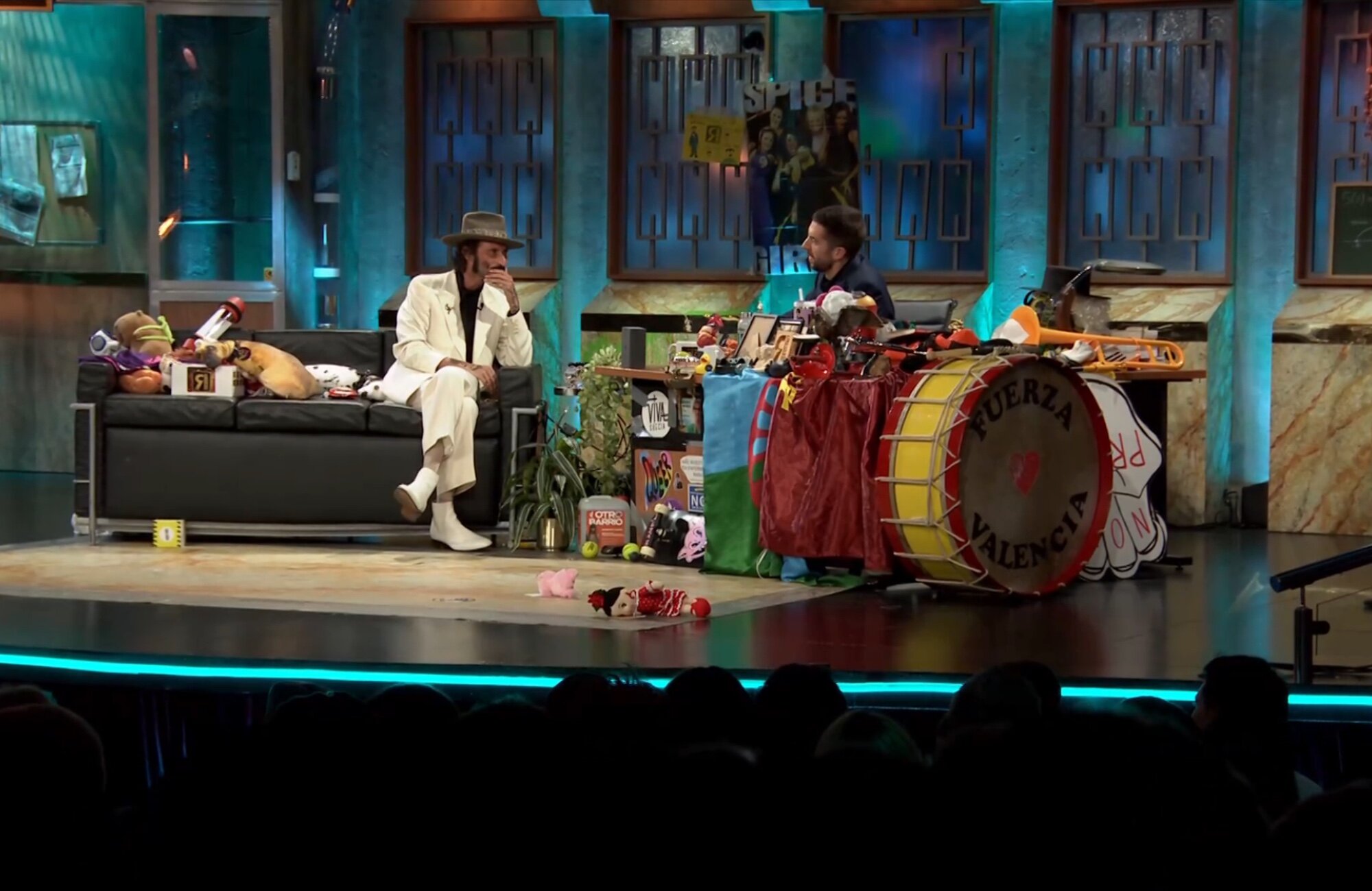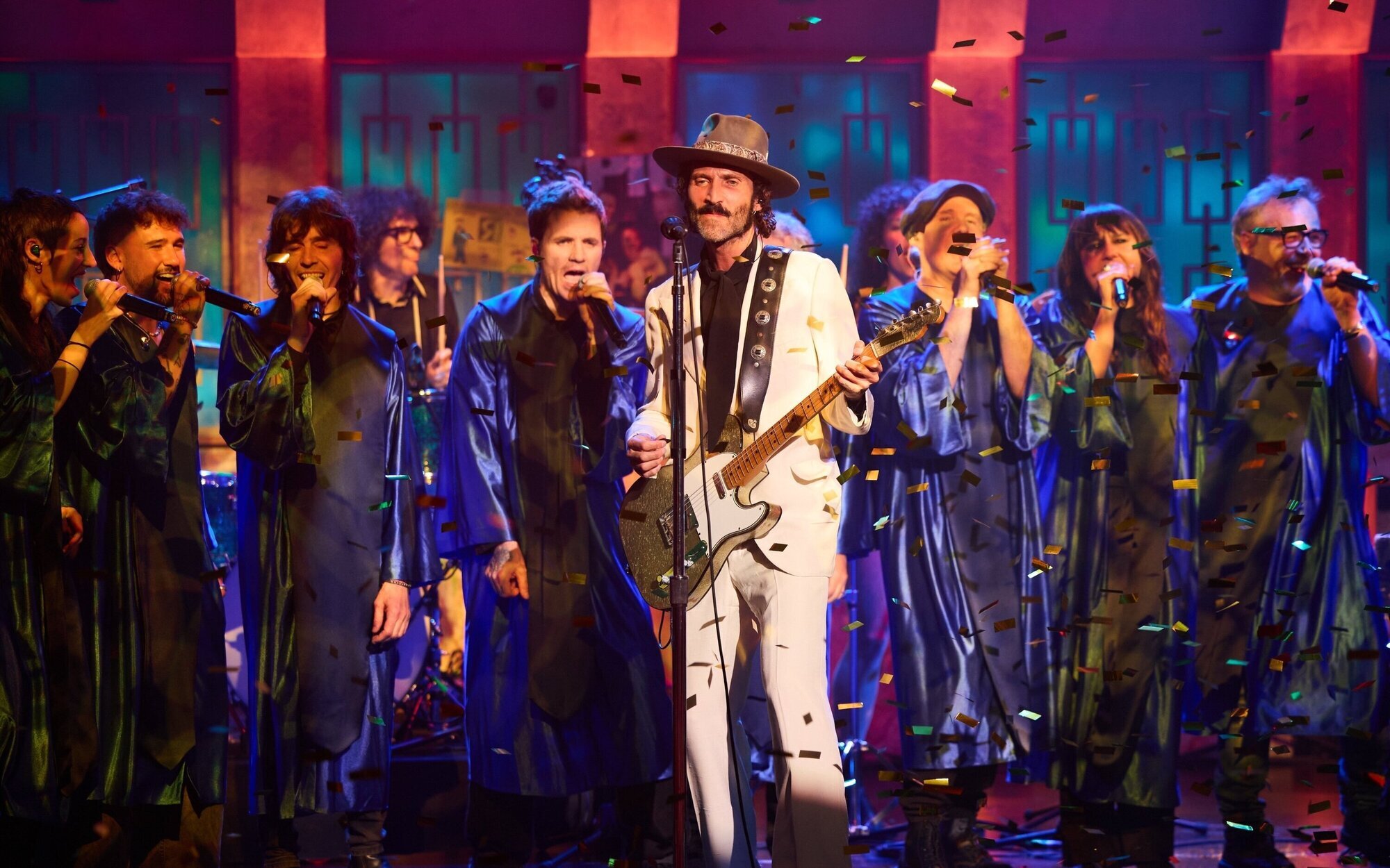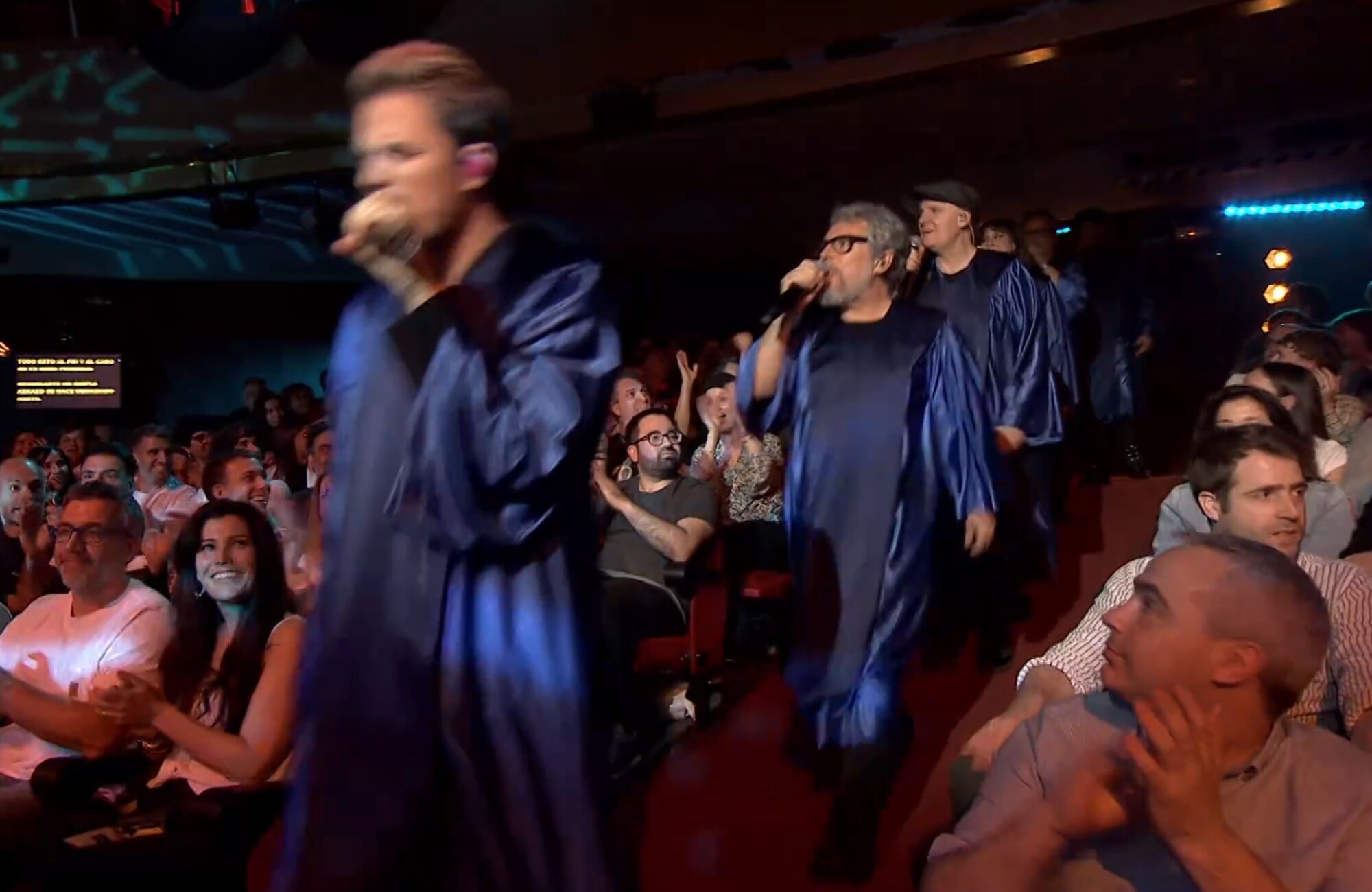El cantante, una vez terminada la entrevista y después de responder a las clásicas preguntas, iba a actuar con su banda para interpretar 'El polvo de los días raros'. Así empezó la actuación, con él en el escenario acompañado por sus músicos. Sin embargo, al poco de empezar la canción, entraban al teatro varios de los artistas españoles de mayor renombre, quienes vestían una toga azul.