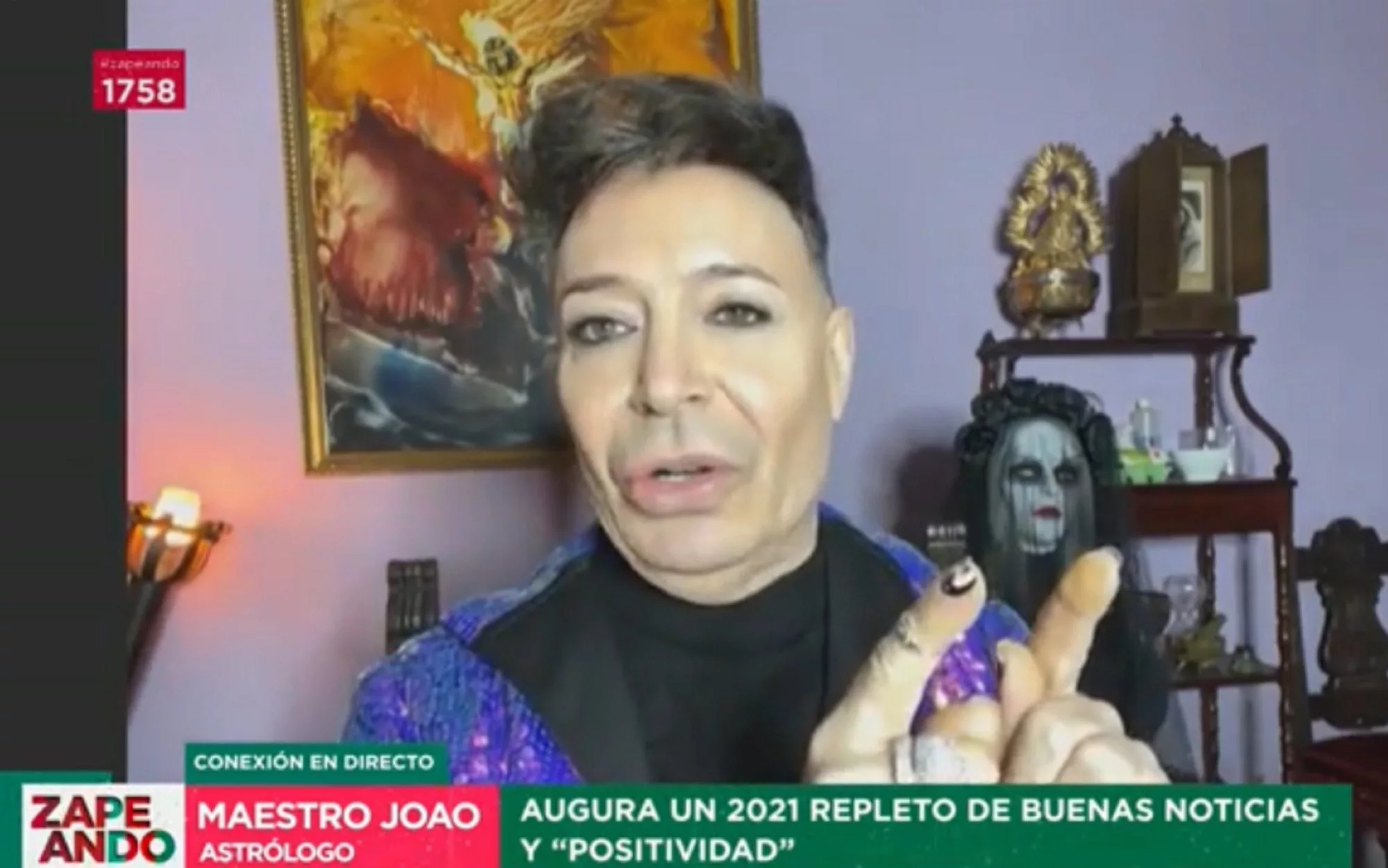 El adivino ha asegurado también que 2021 será un buen año, "cargado de positividad", pues él solo ofrece predicciones optimistas. Esa confesión ha sorprendido al presentador de laSexta porque el adivino tenía como fondo en la videollamada una pared de su casa en la que se veía una muñeca fantasmagórica vestida de negro. "El fondo parece que lo hayas robado del tren de la bruja, ¿quién es esa?", preguntaba Mateo.