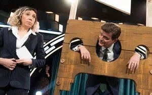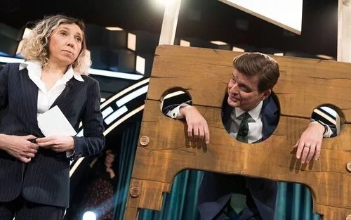 "Y luego, otra cosa: ¿tanto dar la lata con las audiencias y ahora resulta que mi cabeza depende de una llamada de Moncloa? No me jodas. ¿En serio que esto está pasando en España? No doy crédito", soltaba además Giró. El presentador era entonces sorprendido con la entrada de una guillotina, junto a la actriz Judit Martin en el papel de verdugo: "Sea tan amable de poner la cabecita en el agujero, que me han llamado de la Moncloa para decapitarle". "¿Pero ya ha llegado la derecha a la Moncloa? ¿Tan rápido?", preguntaba un anonadado Giró.