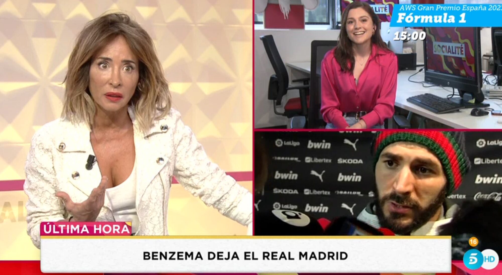 'Socialité' ha adelantado su emisión del domingo 4 de junio para que la Fórmula 1 tuviera espacio en la parrilla de Telecinco, y ese no ha sido el único impacto que ha tenido el deporte en el formato de La Fábrica de la Tele. Tras un arranque centrado en la complicada situación personal de Alejandro Sanz, el programa presentado por María Patiño se ha hecho eco de la noticia más sonada de la mañana: la salida de Karim Benzema del Real Madrid.