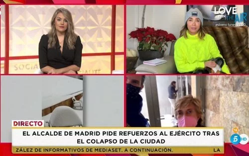 La presentadora ha explicado que no se ha atrevido a llegar a Telecinco en metro porque se ha asustado al salir a la calle por la gruesa capa de nieve. De hecho, ha mostrado un vídeo de su calle, grabado por su pareja, para mostrar cómo la periodista apenas podía andar. Patiño también ha compartido con los espectadores de 'Socialité' la situación en la que se encuentra su terraza, que está llena de nieve, al nivel de sus rodillas aproximadamente, y ha confesado que le preocupa que se convierta en hielo y que el edificio sufra daños por el peso.
