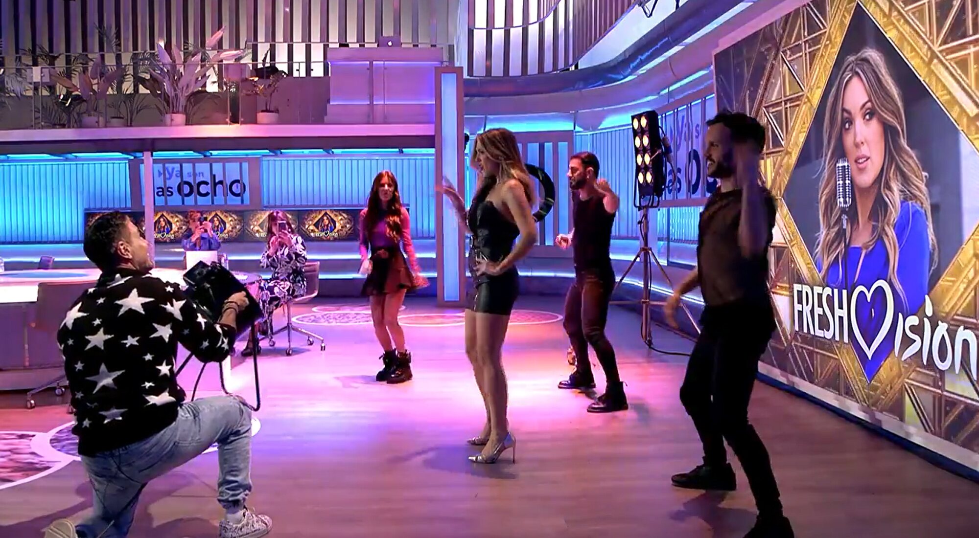 'Ya son las ocho' comenzó su emisión con dos bailarines frente a un pantallón en el que se veía a la propia Riesco, con la palabra "Freshvisión", mientras sonaba el estribillo de la canción con la que la madrileña intentó representar a España en Eurovisión 2010, junto a otras cuatro mujeres, como parte del grupo I-Legal. No obstante, por entonces no logró pasar la primera fase en un año en el que Daniel Diges fue el elegido para acudir al certamen europeo con "Algo pequeñito": de hecho, el grupo ni siquiera alcanzó los 2000 votos en la web donde se podía votar a los distintos candidatos. No obstante, la mayor presencia de la periodista en los medios desde que se diera a conocer su relación con Antonio David Flores, parece haber dejado atrás la falta de popularidad de la canción.