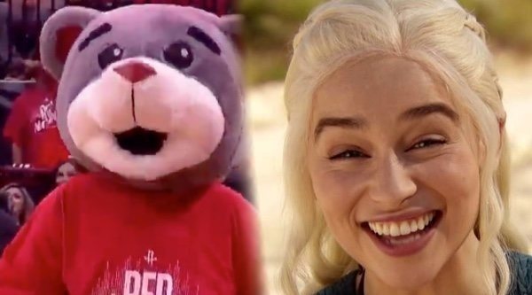 Clutch, nombre de la cómica mascota del equipo texano, se encontraba haciendo su habitual ronda alrededor del estadio para animar y calentar las gradas, cuando de pronto se encontró con la mismísima Madre de Dragones. Ante su presencia, al simpático oso no le quedó más remedio que hincar la rodilla y presentar sus respetos a la Rompedora de Cadenas, acción que dejó llorando de la risa a la intérprete británica.