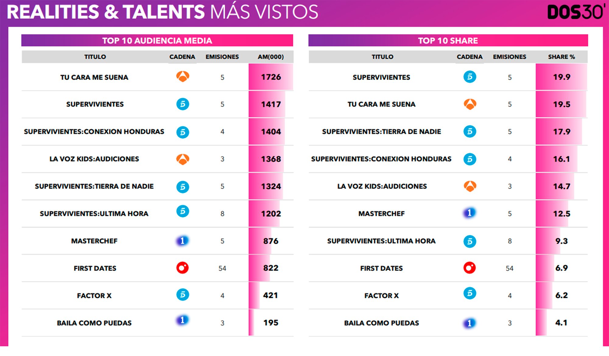A diferencia de los meses anteriores, la empresa de análisis distingue ahora entre el share y los espectadores, generando así dos rankings de cada tipo de programa. En el caso de los realities, 'Tu cara me suena' lidera en el número de espectadores con 1.726.000 de media en cinco emisiones, mientras que 'Supervivientes' hace lo propio en el ranking del top 10 de share tras promediar un 19,9% también en cinco emisiones.