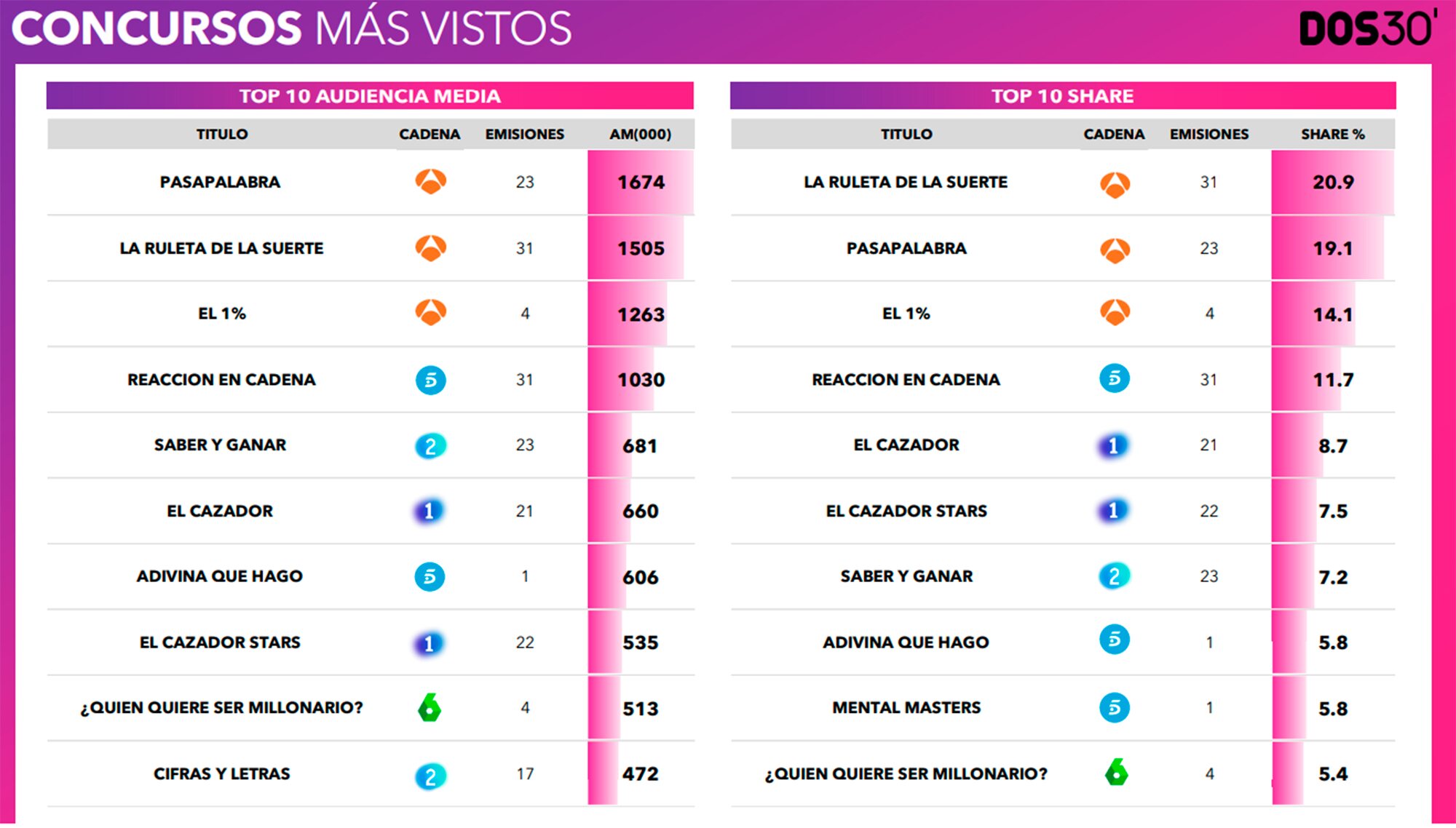 En el terreno de los concursos, 'Pasapalabra' despunta gracias a sus espectadores, mientras 'La ruleta de la suerte' lo hace con su share, que promedia un 20,9% con 31 emisiones. 'El 1%' ocupa la tercera posición en ambos tops, mientras que 'Reacción en cadena' hace lo propio con el cuarto lugar.