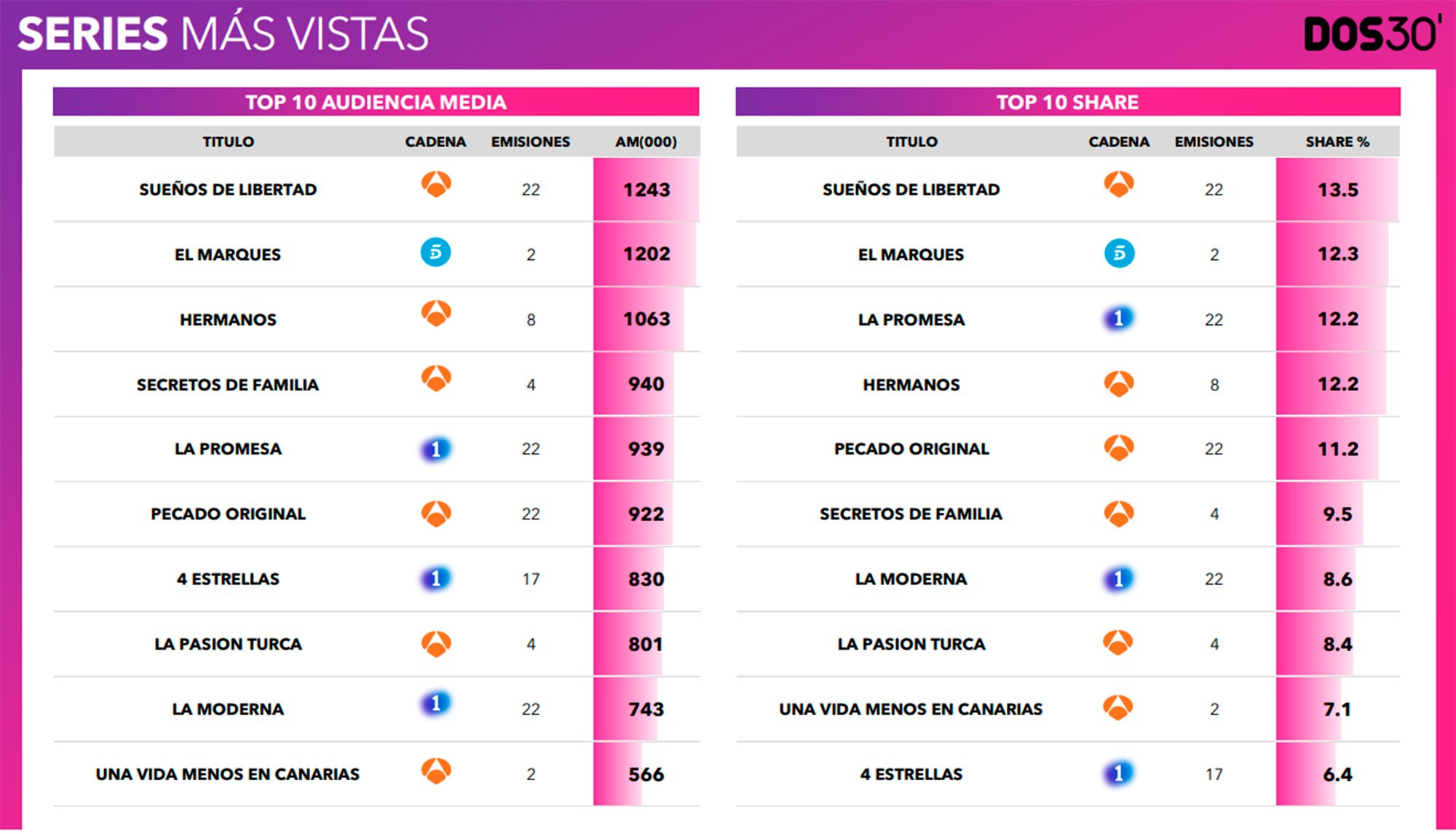 En el ámbito de la ficción, 'Sueños de libertad' lidera ambos tops, tanto gracias a su share como a sus espectadores. Por detrás, 'El Marqués' irrumpe fuerte en la segunda posición, mientras 'Hermanos' se coloca tercera con 1.063.000 espectadores y 'La promesa' registra un 12,2% de share. En cuanto a las emisiones más vistas del mes, como no podía ser de otra manera, Eurovisión arrasa, junto a las votaciones del mismo, mientras que el resto del ranking se tiñe de naranja por Atresmedia.