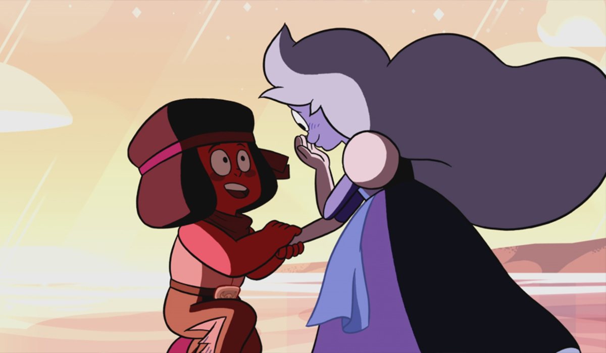 Si pensabas que en los dibujos animados no podían producirse pedidas de matrimonio igual de emotivas que en las producciones protagonizadas por personas, estabas completamente equivocado. 'Steven Universe' demostró que el amor romántico también tiene cabida en la animación sin importar la condición sexual de sus personajes. En concreto, las protagonistas de la historia más bonita de la serie son Rubí y Zafiro, pareja que se consolidó con un compromiso y su posterior boda. Antes de casarse, Rubí fue la encargada de pedirle matrimonio a Zafiro en una secuencia en la que se baja del caballo, le declara sus sentimientos y realiza la pregunta. De esta forma, Rubí le explicaba que así podrán estar juntas para siempre, incluso cuando se encuentren separadas.