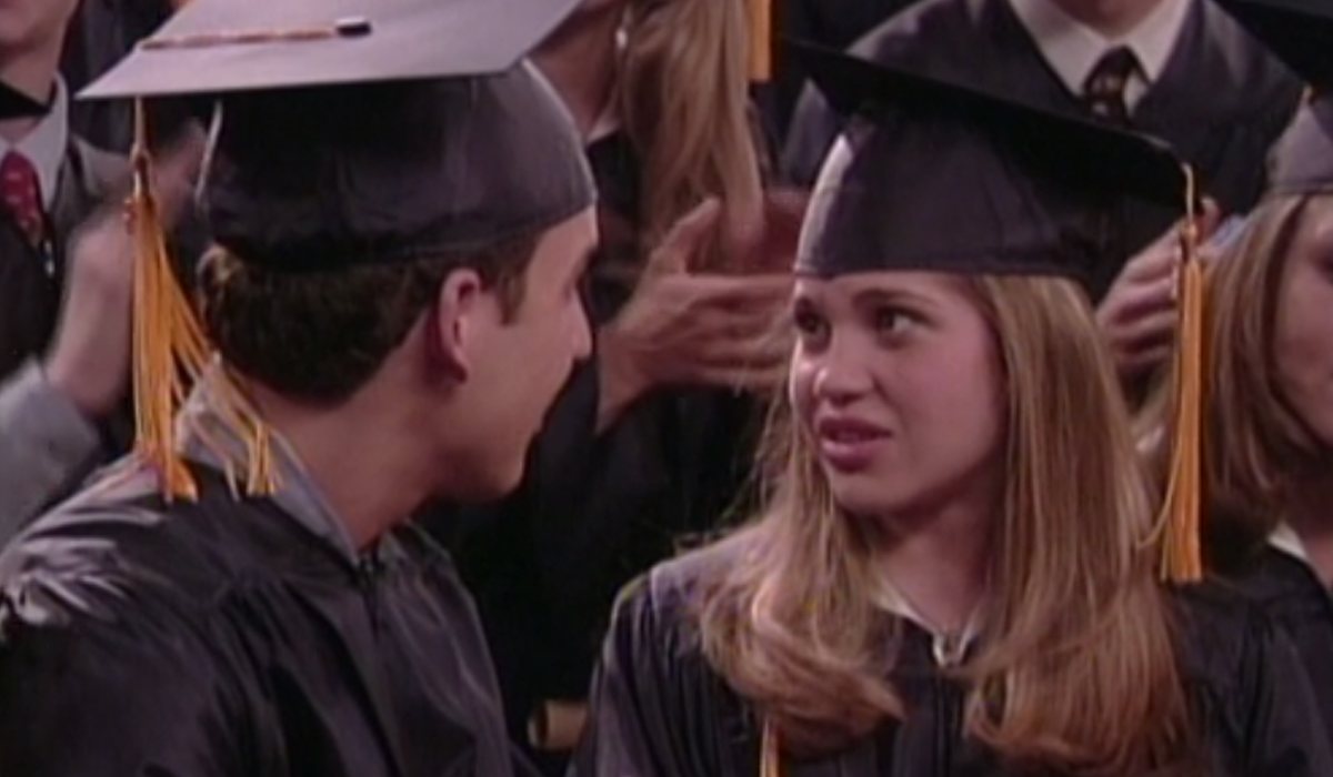 Rompiendo con la anticuada tradición y la creencia de que el chico debe ser siempre quien dé el primer paso y pida matrimonio en la pareja, Topanga (Danielle Fishel) tomó la delantera y fue la encargada de realizar la pregunta a Cory (Ben Savage) en el último capítulo de la quinta tanda de episodios de 'Yo y el mundo'. Para ello, la joven decidió que la graduación del instituto era el momento perfecto para realizar dicha petición y averiguar si su chico quería lo mismo que ella. Sin pensarlo dos veces, mientras sus compañeros estaban de celebración, ellos permanecían sentados y mirándose expectantes después de que Topanga le preguntase si quería casarse con ella. Además, la serie concluyó su quinta temporada dejando en el aire la respuesta de Cory, por lo que los espectadores tuvieron que esperar para saber si el chico aceptaba la propuesta o no.