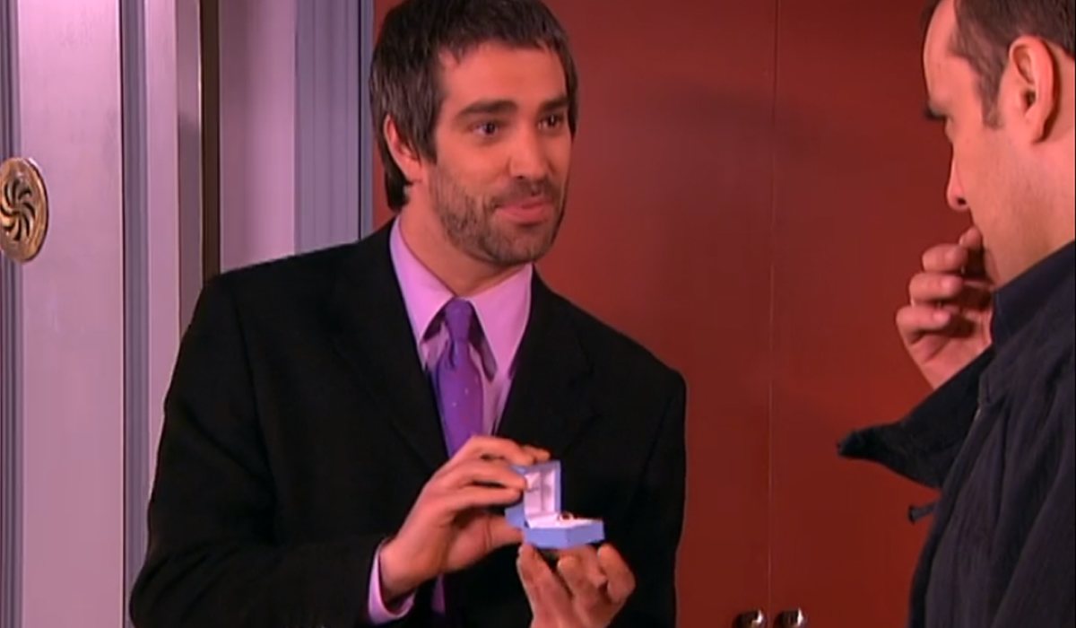 El día de San Valentín es uno de los momentos más románticos del año, quizá por eso es uno de los más elegidos para declararse y pedir matrimonio. En 'Aquí no hay quien viva' un error en la entrega de un ramo de flores el 14 de febrero provocó que Mauri (Luis Merlo) pensara que Fernando (Adrià Collado) le pedía matrimonio, hasta que descubrió que era un presente de Juan para Isabel. Sin embargo, Fernando supo cómo arreglar la situación y preparó una pedida de mano mucho más elaborada y detallada. De este modo, Mauri entró en casa y se la encontró toda llena de flores y velas. Con la ayuda de Valentín, que apareció por la puerta con una tarjeta esta vez sí escrita por Fernando, Mauri descubría que su novio quería casarse con él. Acto seguido Fernando hacía acto de presencia y le entregaba el anillo con el que sellaban el compromiso. El romántico momento se interrumpía ante la entrada de una ilusionada Vicenta, que no podía esconder la emoción que sentía por haberles ayudado.