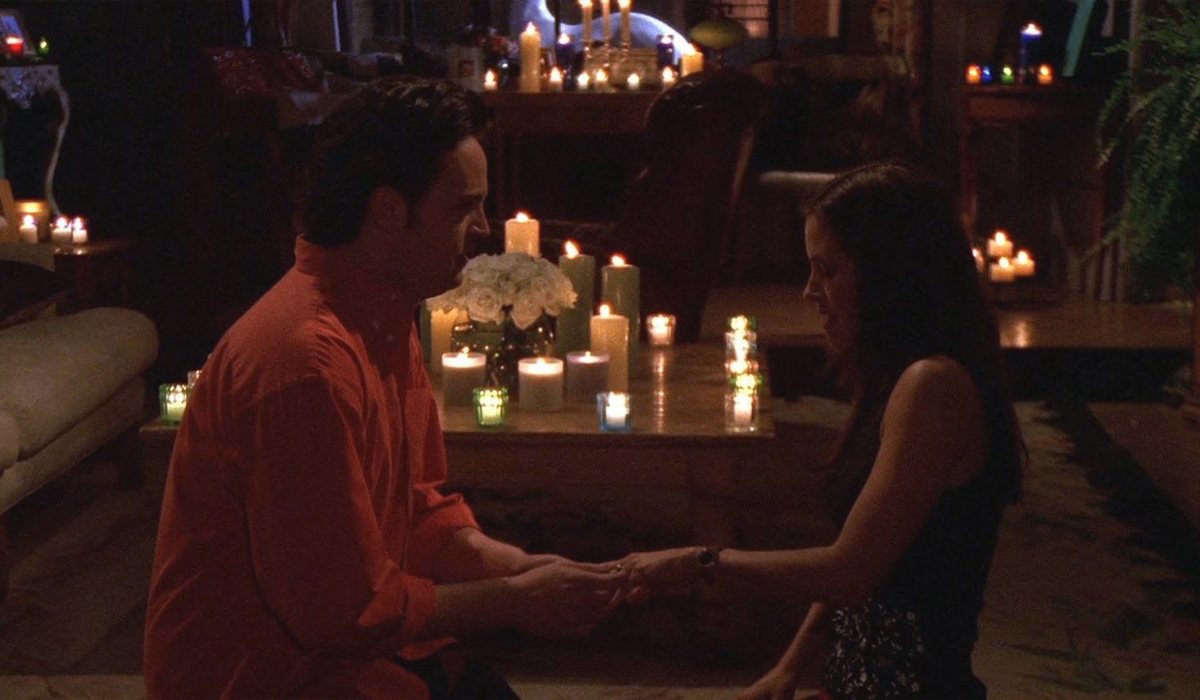 Utilizando a Joey (Matt LeBlanc) como gancho, Mónica (Courteney Cox) elaboró una sorpresa que dejó con la boca abierta a Chandler (Matthew Perry) en 'Friends'. Así pues, cuando él creía que había perdido a su chica, entró en casa y se la encontró en el salón y rodeada de velas. En ese momento, Mónica se ponía de rodillas para confesarle que se sentía muy afortunada, pero las lágrimas le impedían avanzar, motivo por el que Chandler también se arrodilló para terminar lo que su chica había comenzado. La situación se vuelve divertida cuando la emoción también puede con él, pero finalmente logra expresar sus sentimientos, le explica que le hace la persona más feliz del mundo y, por fin, realiza la tan ansiada pedida de matrimonio. En ese escenario tan romántico, entre lágrimas y con sus amigos detrás de la puerta escuchando y esperando a poder entrar, Mónica acepta para comenzar una nueva vida juntos.