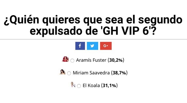 Un nuevo concursante abandonará la casa de Guadalix este jueves. Según los usuarios de FormulaTV, esta será Miriam Saavedra. La que ganó el duelo a Chabelita en la primera expulsión de 'GH VIP' se juega la nueva expulsión entre El Koala y Aramís Fuster, y abandonaría la casa según el 38,7% de los votos. Unos resultados muy igualados en los que entre Miriam y el menos votado tan solo existe una diferencia de ocho puntos y medio.