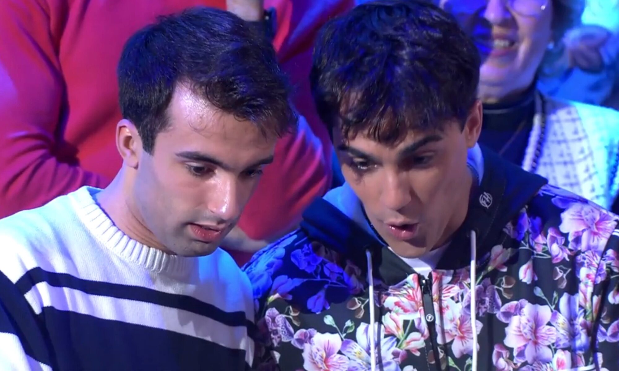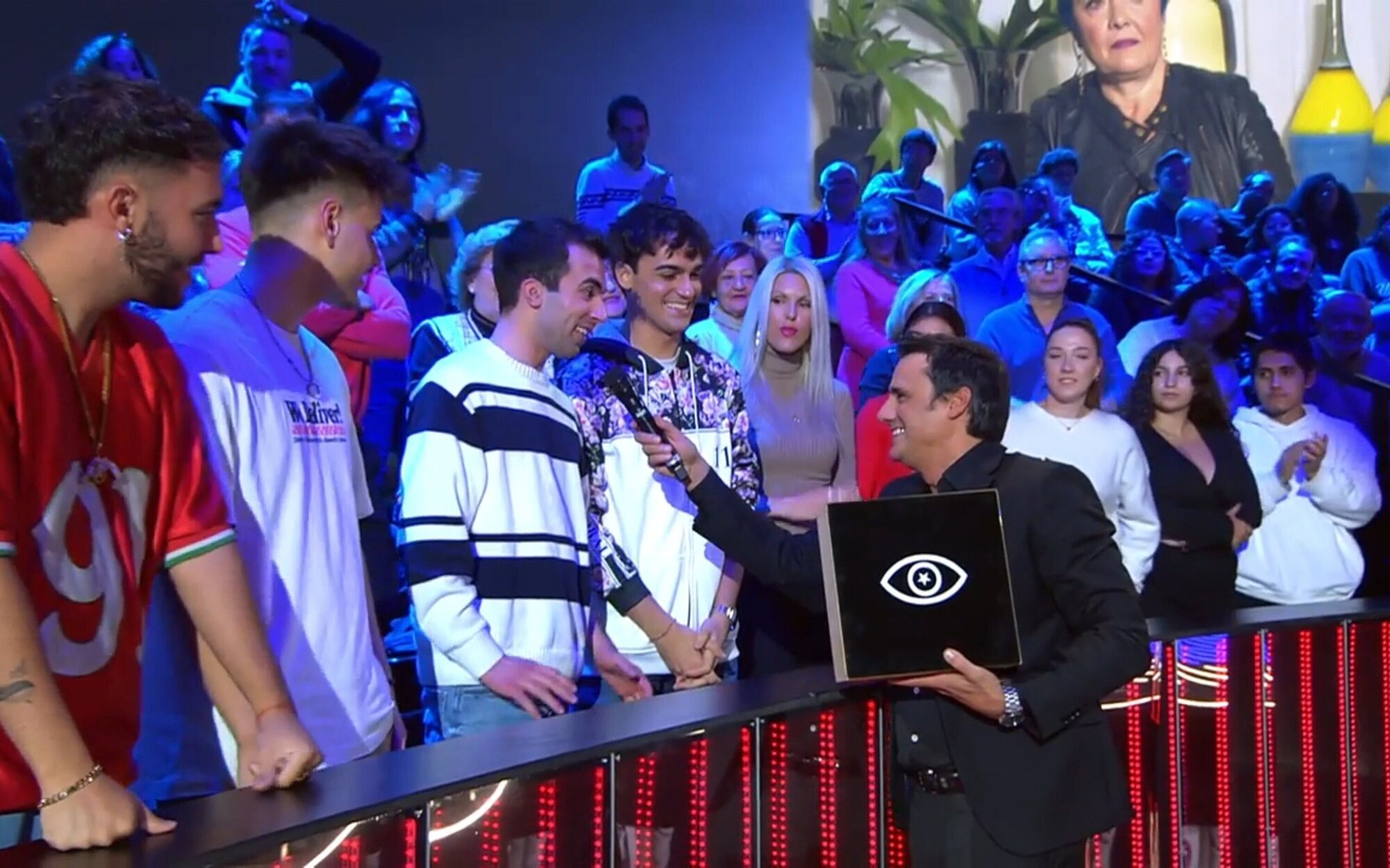 Se trataba de dos de los Mozos de Arousa, concretamente Borjamina y Bruno, quienes después de estar esa misma tarde en 'Fiesta' siguieron después en las instalaciones de Mediaset para ver en directo el debate de 'Gran Hermano VIP'. Cuando el presentador se acercó a ellos y se dieron un abrazo, les preguntó qué les estaba pareciendo y ellos respondieron que estaban disfrutando, que esto "está esto calentito" y que "no es lo mismo verlo desde casa y queríamos vivirlo en directo, así que muchas gracias".