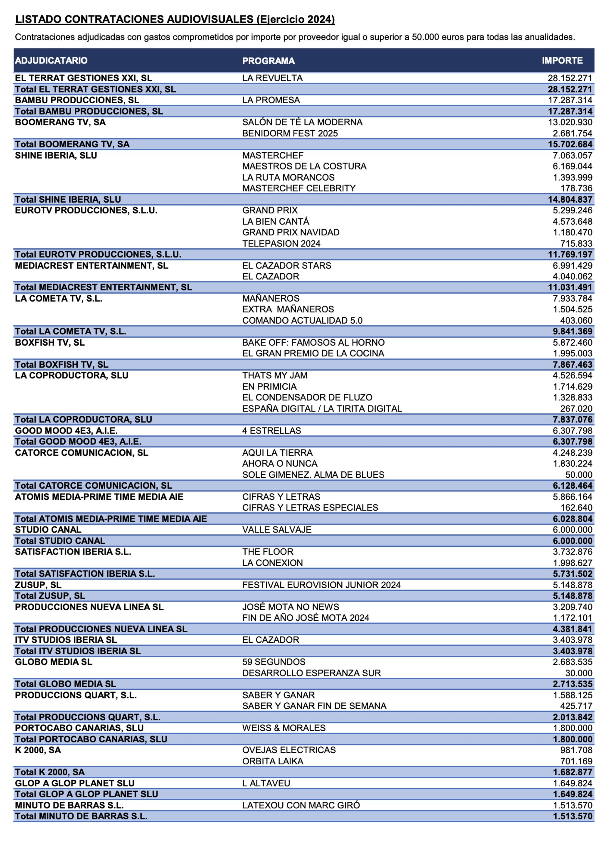 Así, le siguen EuroTV Producciones SLU, Mediacrest Entertainment SL, La cometa SL, Boxfish TV SL, La Coproductora y Good Mood entre muchas otras, hasta llegar a un total de 227.785.107 euros que se reflejan en la suma total de contrataciones adjudicadas durante el año 2024. A contuación, el listado completo.