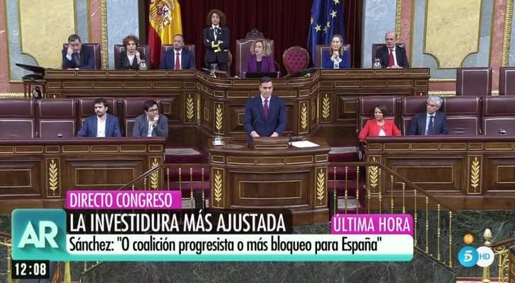 Telecinco ha decidido apostar por Ana Rosa Quintana para informar en directo de todo lo que ha sucedido en el Congreso. Por ello ha decidido emitir 'El programa de Ana Rosa' toda la mañana, hasta las 15h00, momento en el que ha tomado el relevo 'Informativos Telecinco 15:00'. De esta forma, se ha prescindido de la emisión de 'Ya es mediodía' con Sonsoles Ónega al frente. A lo largo de la mañana se han realizado diversos debates relacionados con la investidura y se ha conectado constantemente con el Congreso de los Diputados en el centro de Madrid. Pese a ello, sí se ha ido dando cobertura a otro tipo de temas no relacionados con la política, se ha evitado por tanto en focalizar toda la atención en la investidura de Pedro Sánchez.